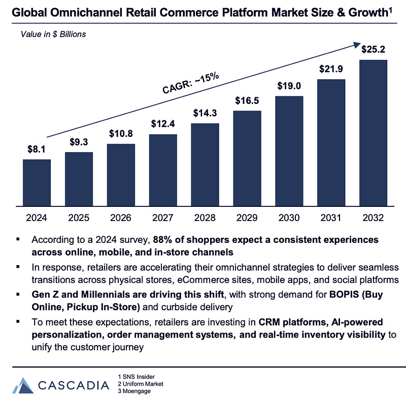 据CASCADIA报告显示,全球全渠道零售商务平台市场预计在2030年突破200亿美元规模,年复合增长率接近15%。在经历了互联网、移动互联网、物联网几轮沉淀以后,新一轮的AI浪潮下,零售巨头们都在努力让AI从过去单一的报表与看板模式,迈向经营决策与执行。