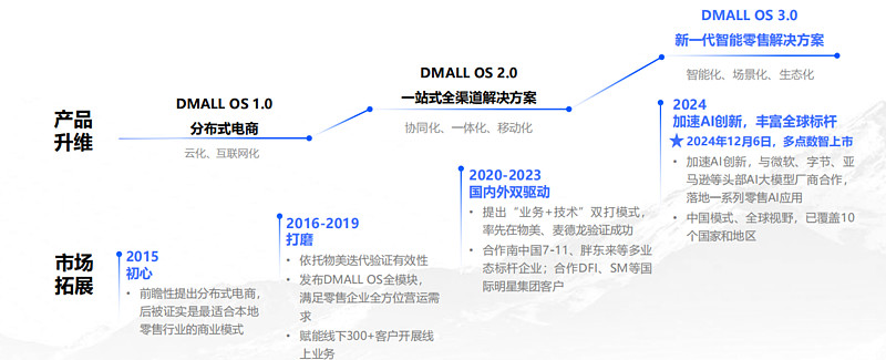 早期公司做的事情很纯粹,2015年切入零售市场,主要是把线下零售的交易、会员、库存、履约这些核心链路数字化,通过Dmall OS把一套完整系统搭起来,再向外复制。