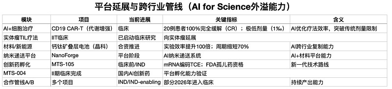 这里需要特别提的一点就是,晶泰同时在拓展细胞治疗、材料、新能源等方向,AI平台能力也在快速外溢。