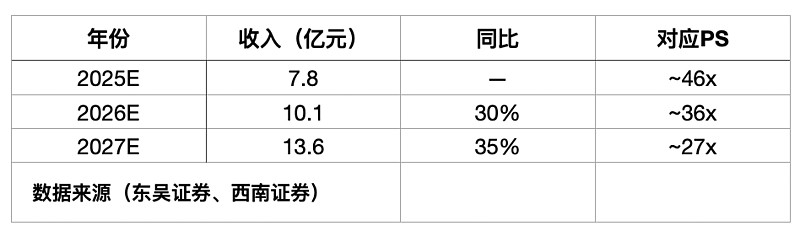 考虑到2025年实际收入为8.026亿元,若以30%计算,对应2026年PS则为33倍。