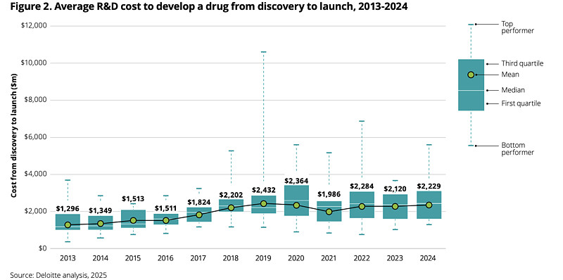 药物研发尤其如此。Deloitte在2025年发布的报告提到,全球大型药企2024年单个研发资产的平均成本已经达到22.3亿美元。