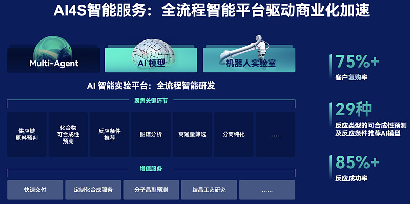 AI4S智能服务这块业务更像基于AI+机器人+ Multi-Agent智能化研发一体化平台。这类业务被大客户验证以后,已经进入复购、数据增强、模型迭代、再复购的正循环。复购率75%以上,就是这个循环已经转起来的证据。