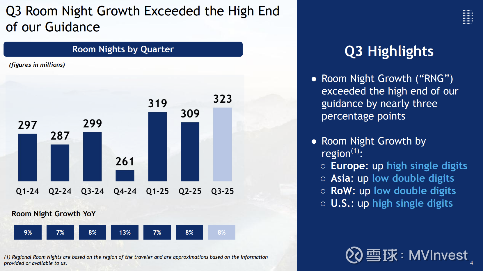 首席财务官 Ewout Steenbergen 补充道:“第三季度间夜量同比增长 8%,在去年强劲基数上依然超出指引上限近 3 个百分点。调整后 EBITDA 达 42 亿美元,同比增长 15%。”