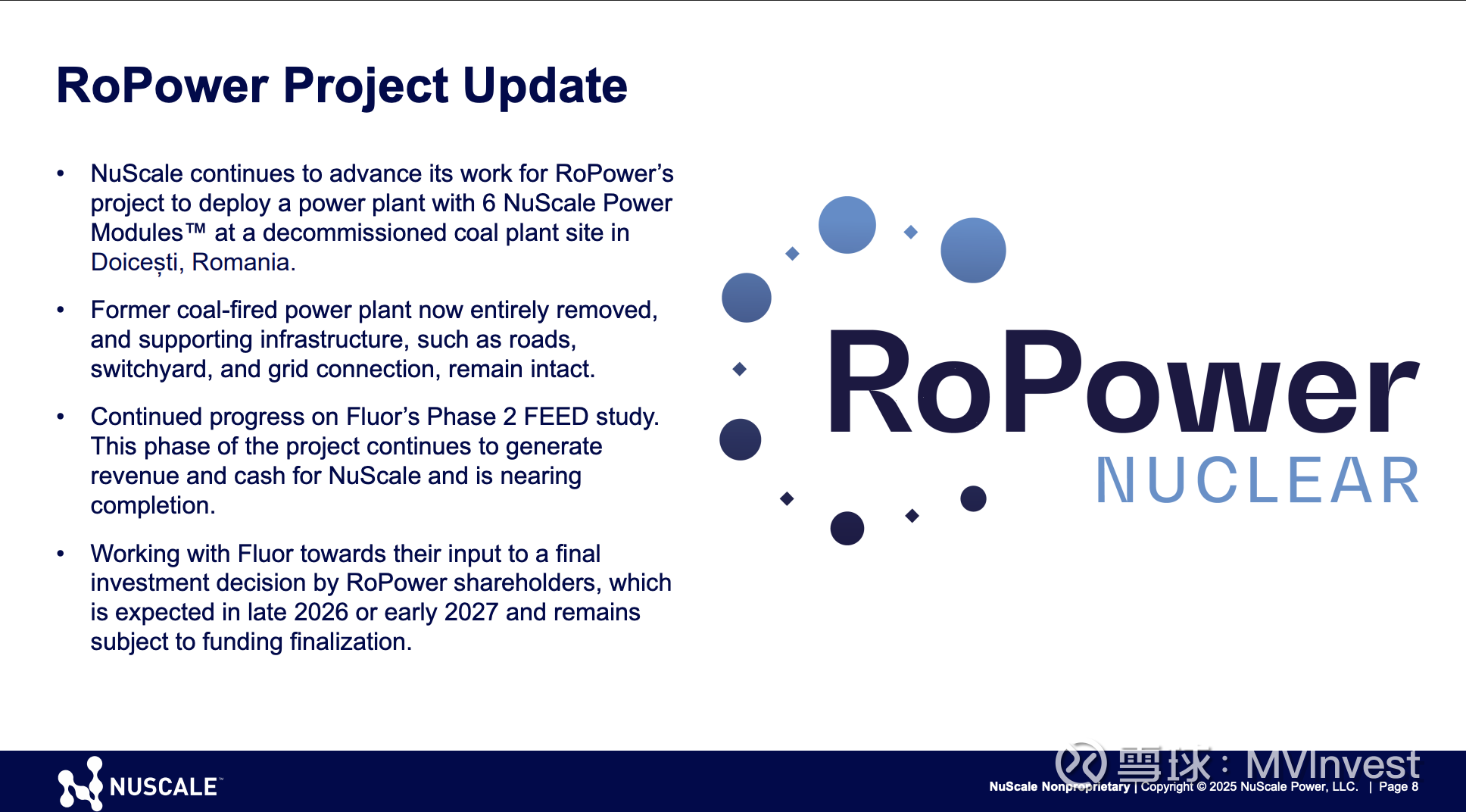 NuScale 正与 Fluor 合作推进罗马尼亚 Doicesti SMR 项目(前燃煤电厂改造)。项目已进入 FEED 2(二阶段前端工程设计),持续为 NuScale 贡献现金流。预计 2026 年底至 2027 年初 迎来最终投资决策(FID)。