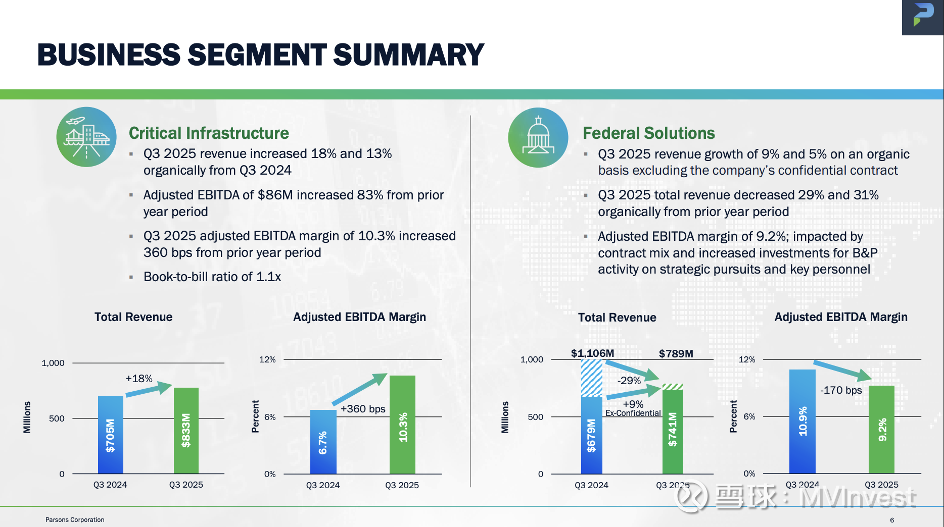 Smith指出,Parsons在剔除保密合约后实现了总营收增长14%、有机营收增长9%,其中关键基础设施部门增长18%、联邦解决方案部门增长9%。她还提到,公司完成了一项涉水领域的收购,增强了佛罗里达地区的能力。