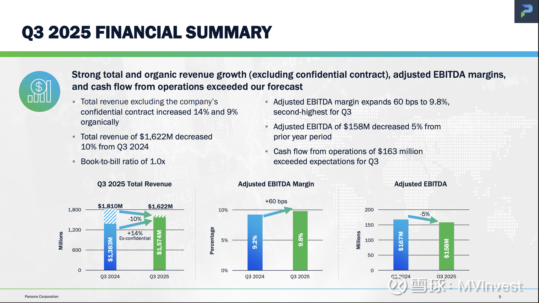 $Parsons(PSN)$ 首席执行官 Carey Smith 表示,公司业绩持续强劲,强调“在剔除保密合约的情况下,我们实现了行业领先的有机营收增长,大幅提升了调整后EBITDA利润率,超出现金流预期,并赢得多项战略合同。”