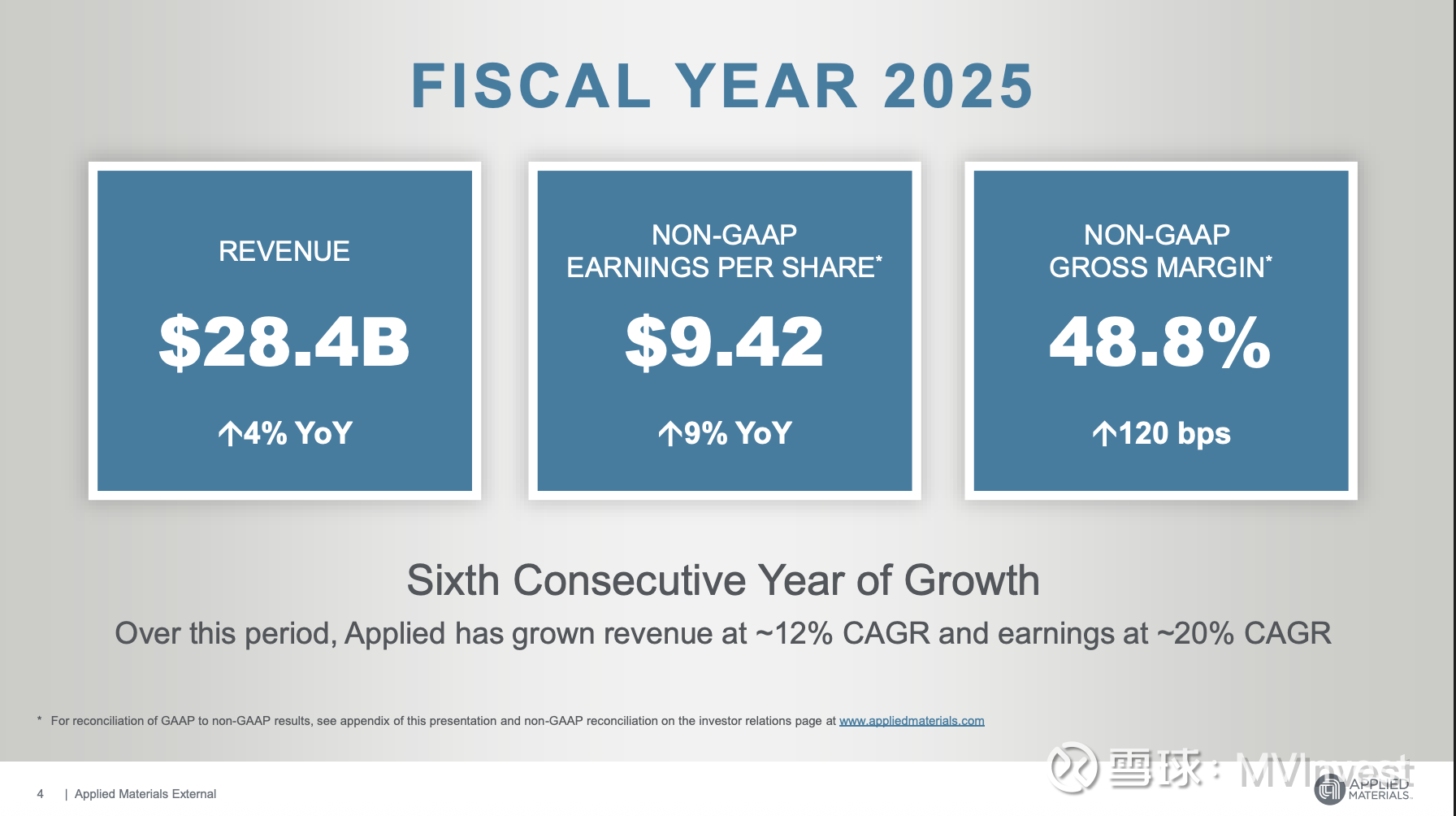 $应用材料公司(AMAT)$ CEO Gary Dickerson表示,公司2025财年第四季度业绩超出指引中值,连续第六年实现增长。他强调:"过去六年,公司营收和盈利年均复合增长率分别达12%和20%。"