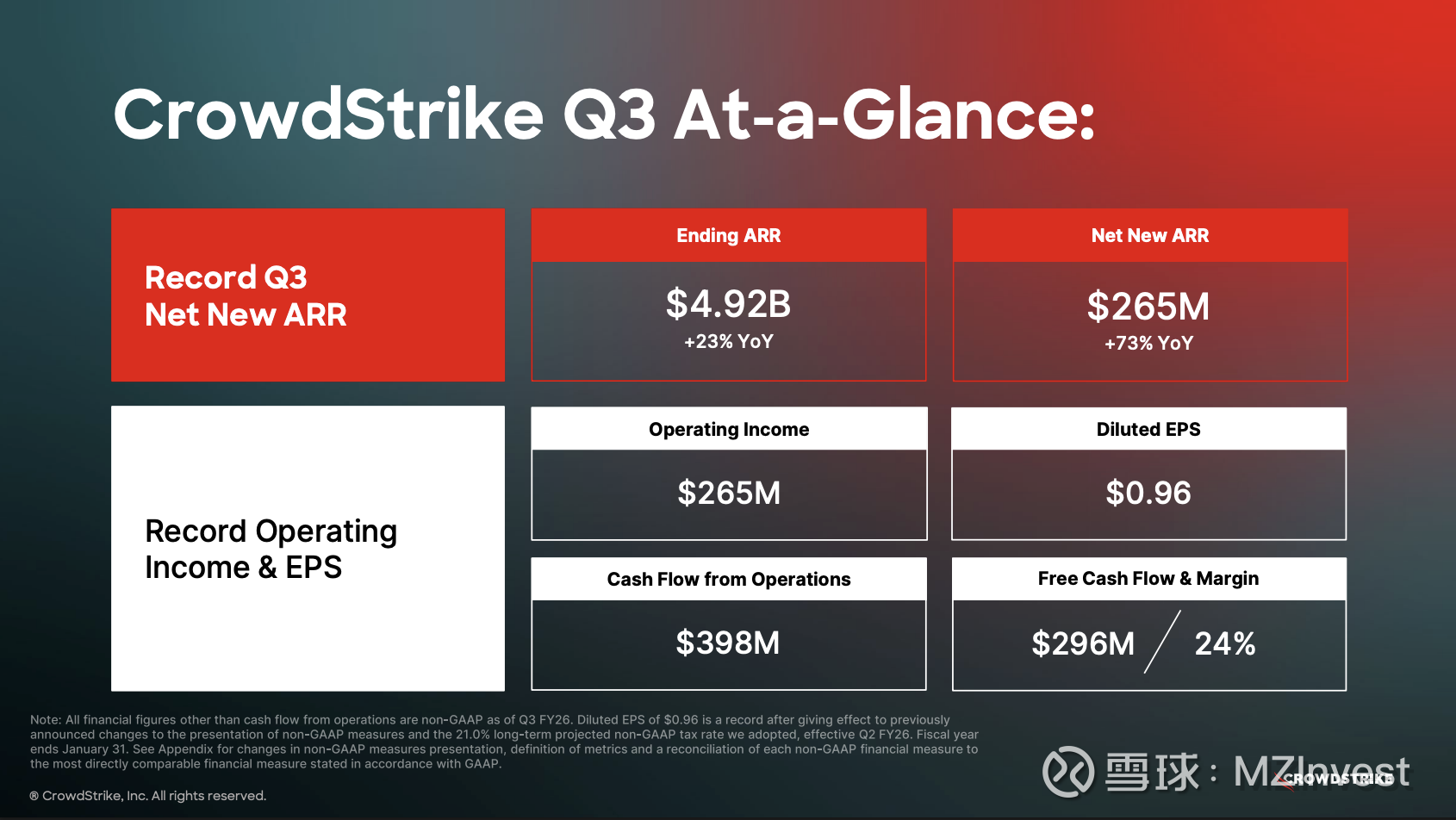 $CrowdStrike Holdings(CRWD)$ 首席执行官乔治·库尔茨 (George Kurtz) 开场表示:“我很高兴分享 CrowdStrike 精彩的第三季度业绩。 这是一个创纪录的季度,业务持续加速。”他重点指出第三季度新增年度经常性收入(Net New ARR)创下 2.65 亿美元 的纪录,实现 73% 的同比增长;以及 49.2 亿美元 的期末年度经常性收入(Ending ARR),同比增长加速至 23%。库尔茨强调:“已采用 Falcon Flex 订阅模式的客户贡献的期末年度经常性收入超过 13.5 亿美元,同比增长超过 200%。”
