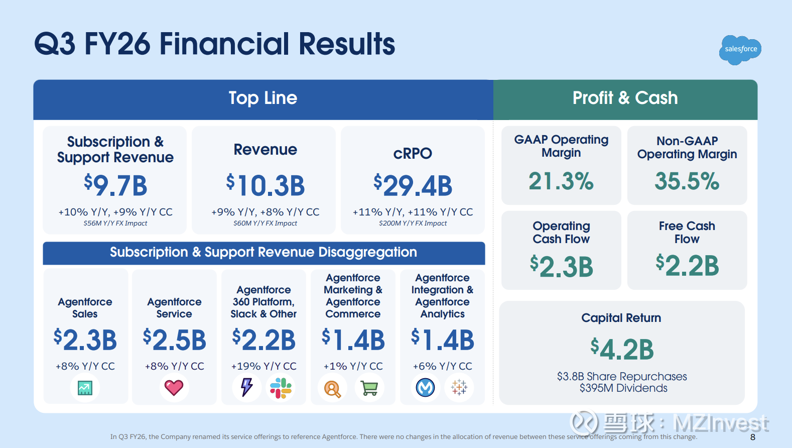 Agentforce 和 Data 360 的 ARR 同比增长 114%,其中 Agentforce 的 ARR 同比增长 330%。
