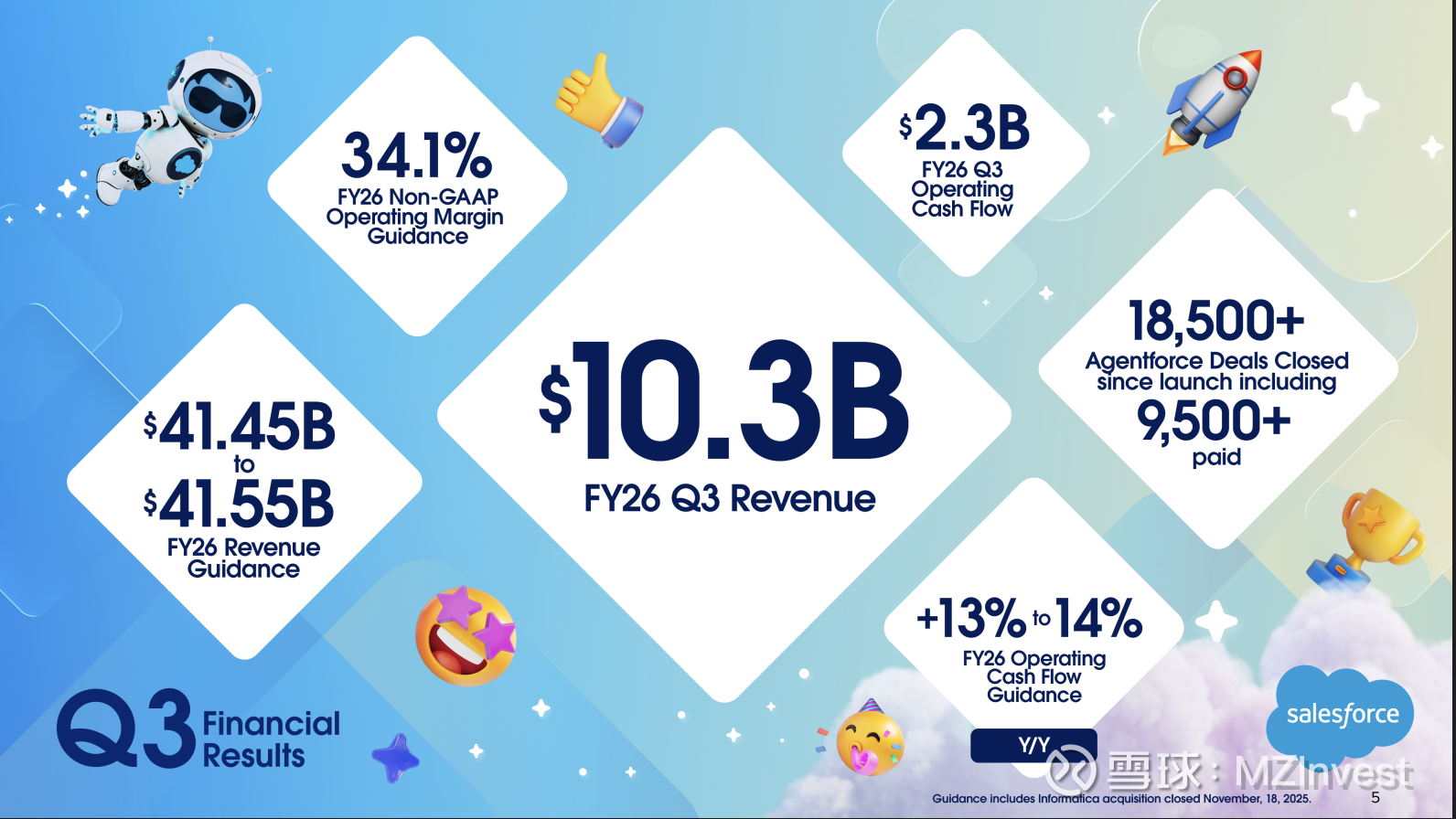 Benioff 报告第三季度收入为 102.6 亿美元,同比增长 9%,并指出非公认会计准则(non-GAAP)营业利润率为 35.5%。