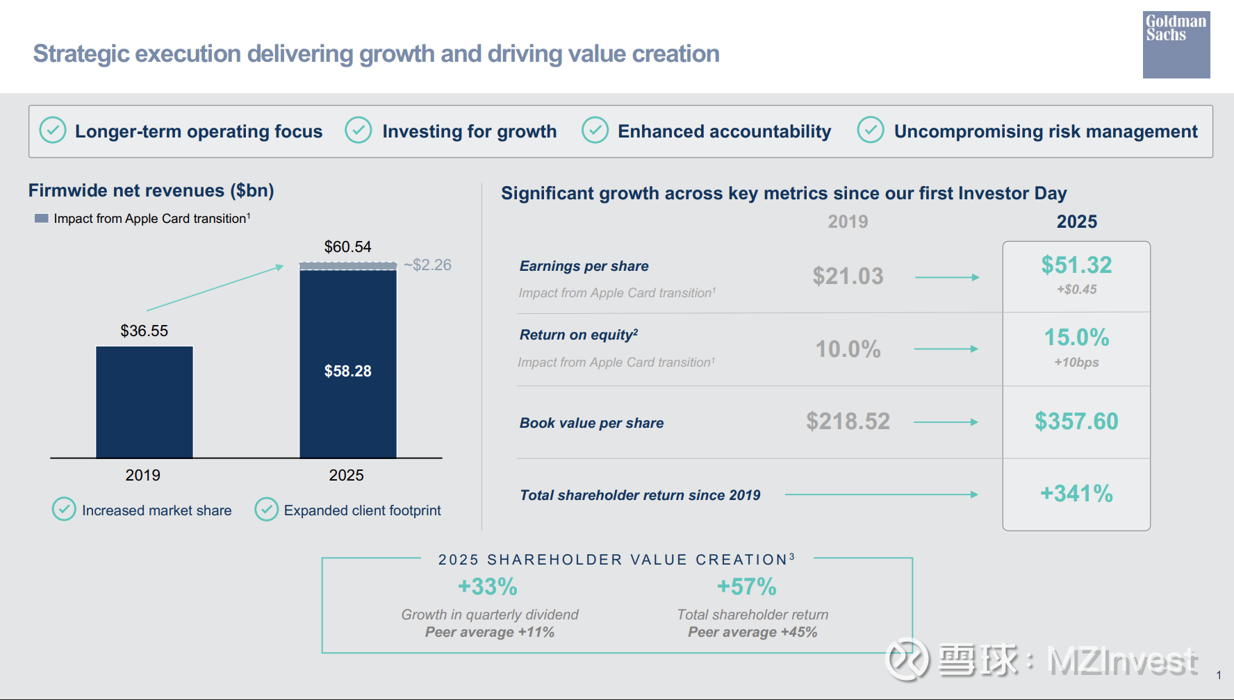 高盛管理层强调了强劲的第四季度和全年业绩、战略重点的收缩,以及新增长和盈利目标的设定(特别是在资产与财富管理领域)。苹果卡组合的迁移、股息的大幅增加以及强劲的资本部署,凸显了公司在有利的资本市场环境以及对技术和人才持续投资的背景下,对交付持久回报的信心。