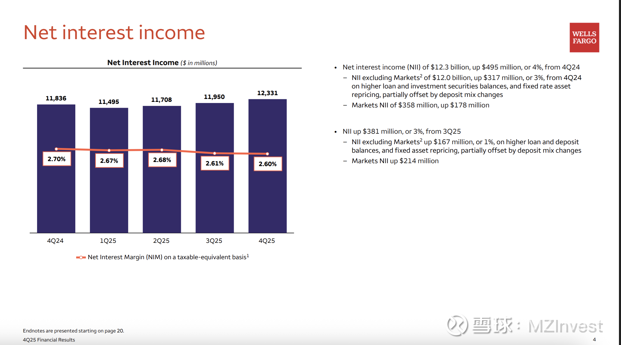 – NII 变动: 较第三季度增加 3.81 亿美元(3%),主要受市场类 NII 增加驱动。扣除市场部分后,受贷款和存款余额增加影响,NII 增加了 1.67 亿美元。