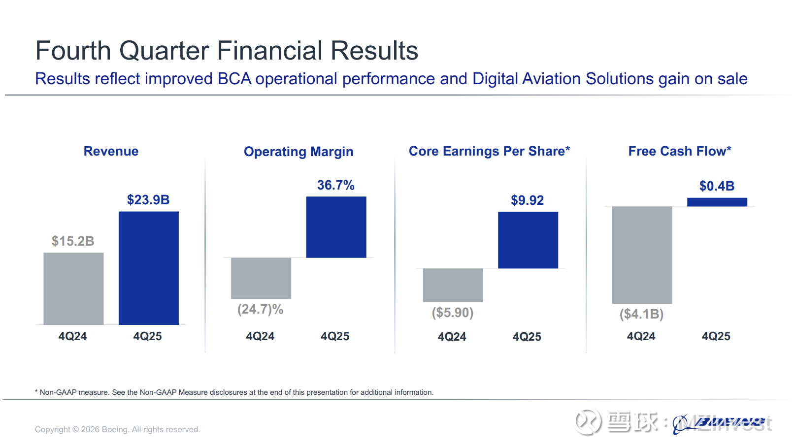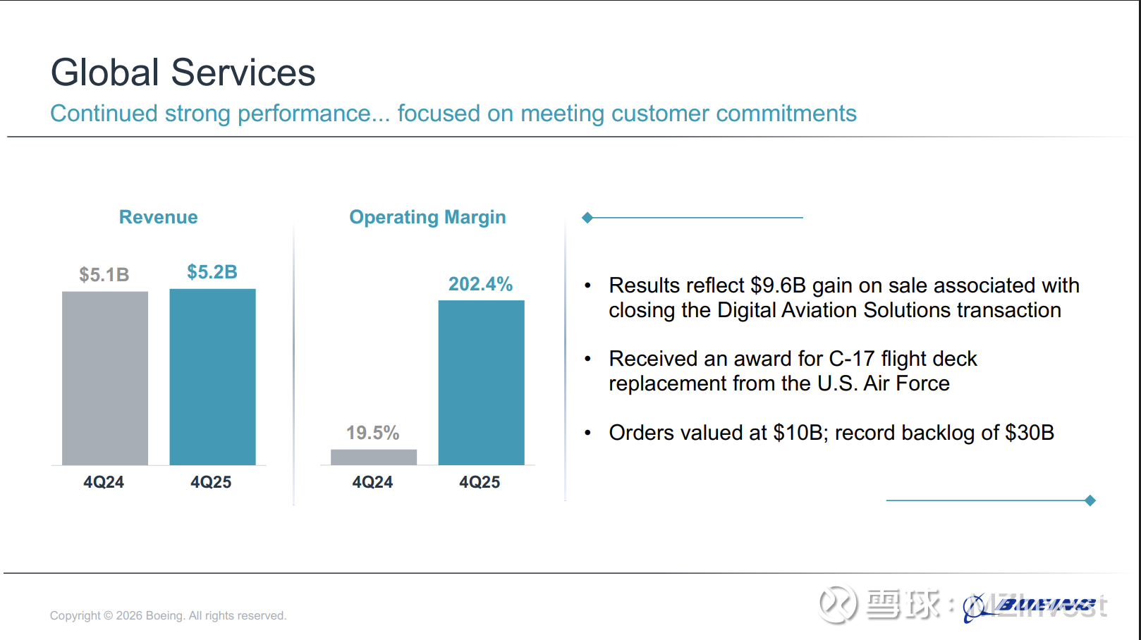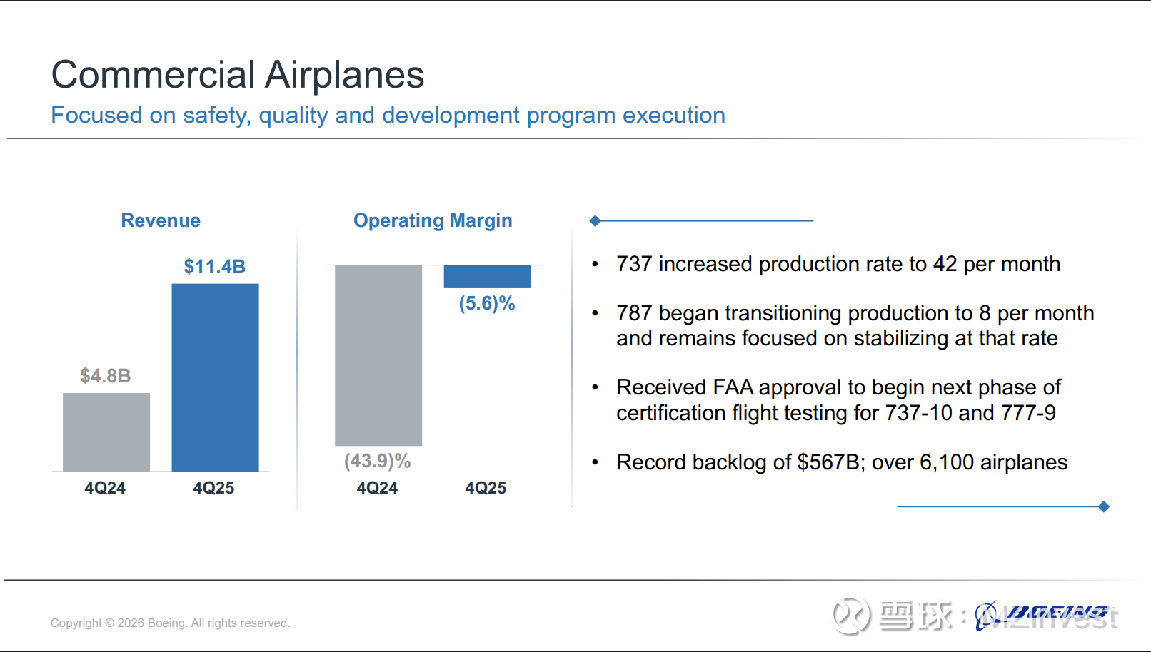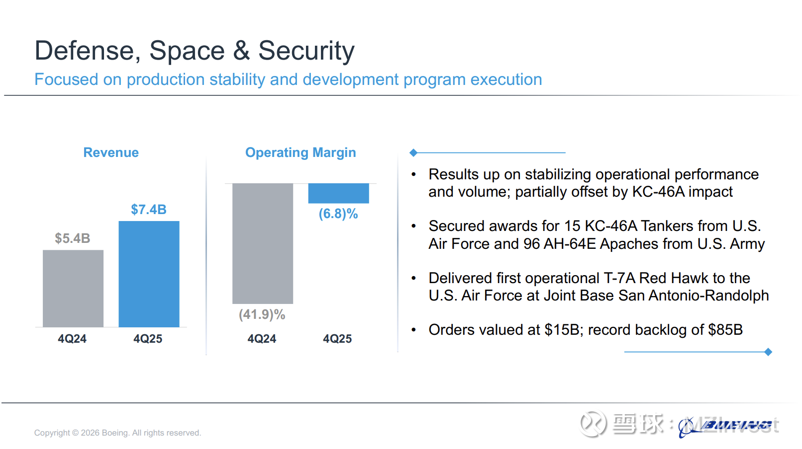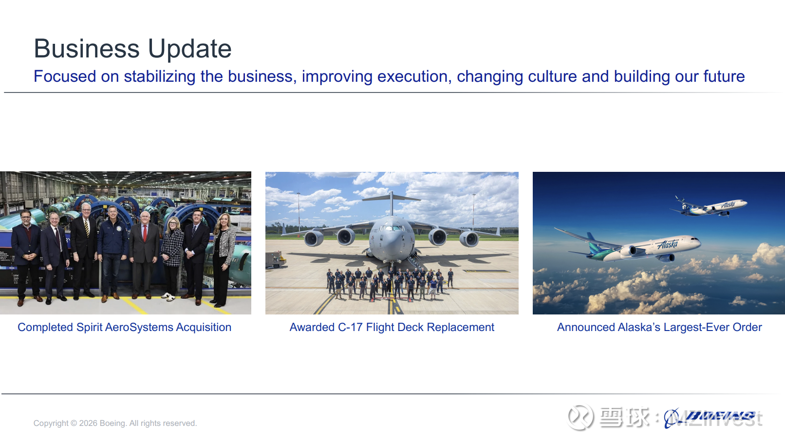 奥特伯格还透露,公司赢得了一项“具有转型意义的合同,即为美国空军建造第六代战斗机”,并完成了对 Spirit AeroSystems 的收购,预计这将“加强我们在工厂、运营和供应链中提高安全与质量的努力”。