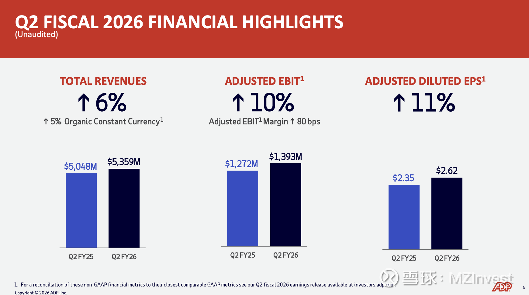 $自动数据处理(ADP)$ 业绩概况:总裁兼首席执行官 Maria Black 报告称,第二季度营收增长 6%,调整后 EBIT 利润率扩大 80 个基点,调整后 EPS(每股收益)增长 11%。她强调了国际业务、美国企业级市场、合规业务、小微企业及中端市场各板块的全面增长。