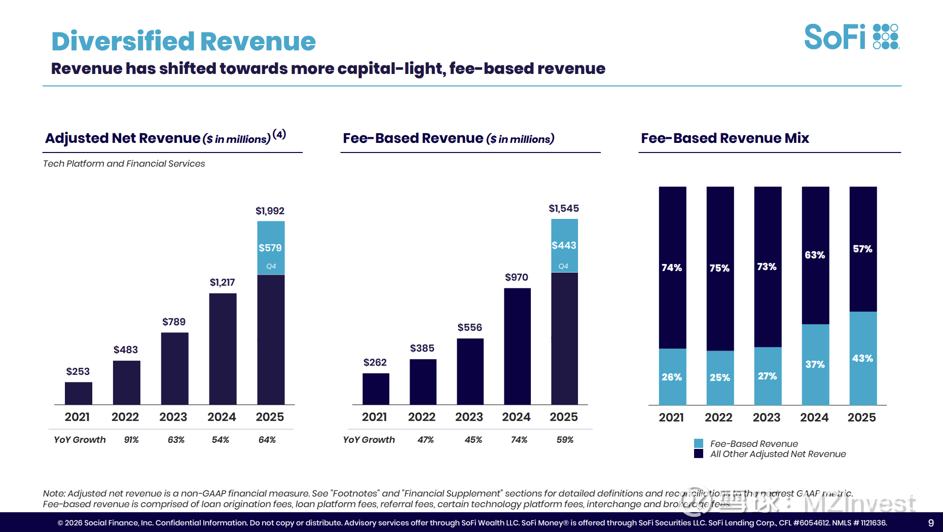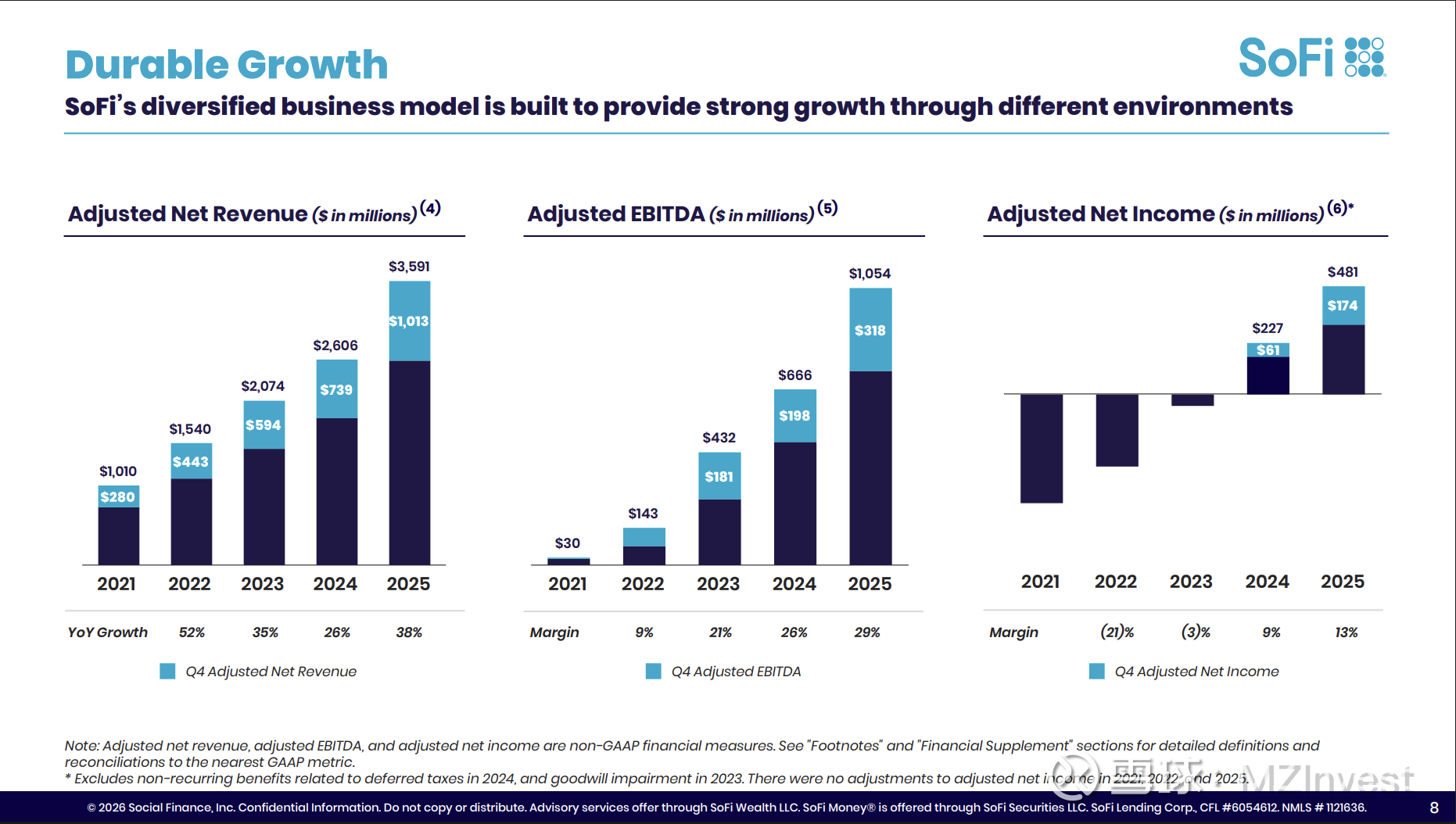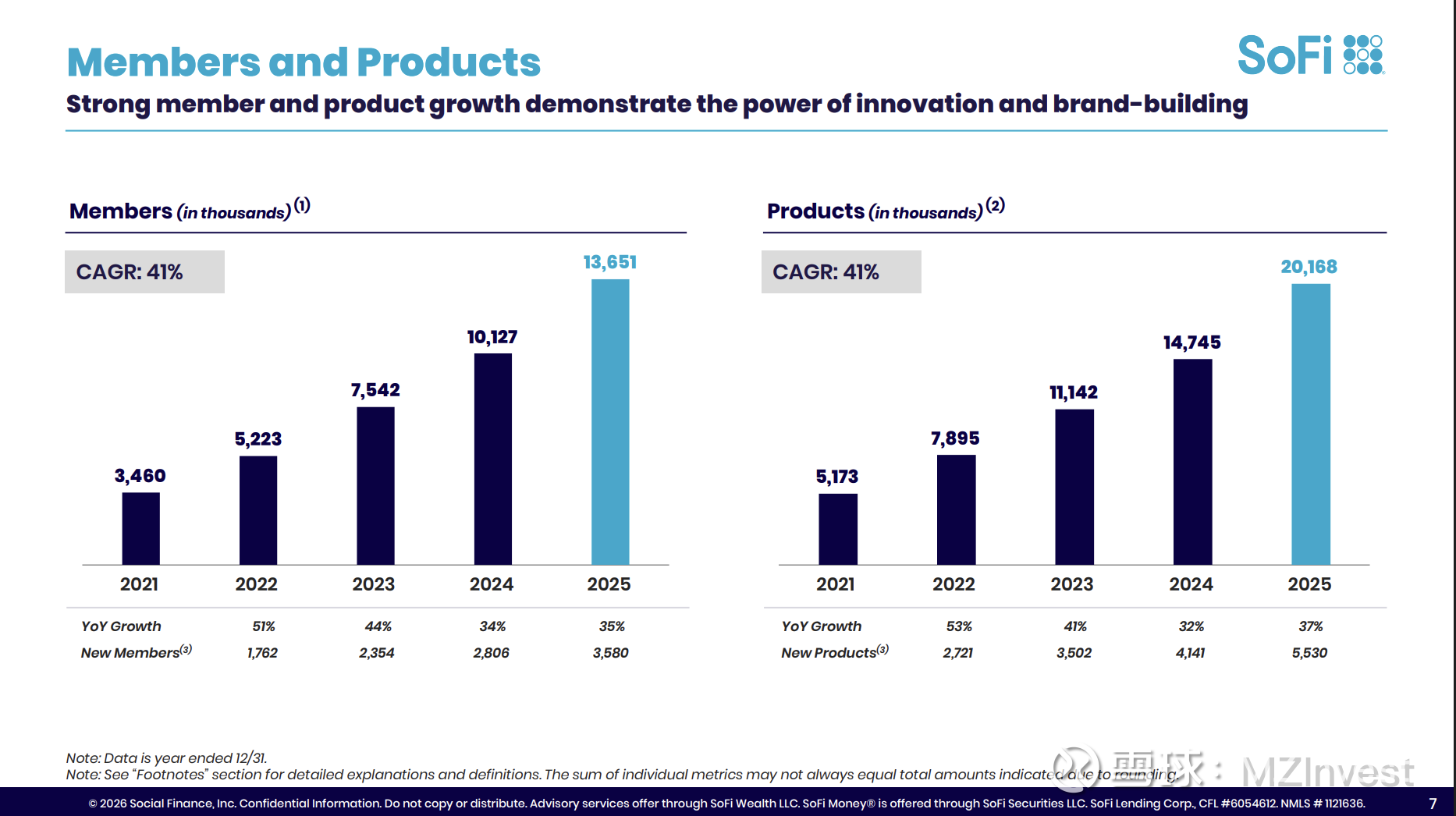 $SoFi Technologies(SOFI)$ 首席执行官 Anthony Noto 强调:“2025 年在各方面都是非凡的一年。我们以会员为中心的理念推动了全业务线前所未有的创新,从而实现了公司历史上最强劲的财务业绩。”他重点提到了 SoFi 的规模化会员基数已达 1,370 万,是 2018 年(65 万)的 20 倍以上,且品牌知名度从 2018 年的约 2% 提升至近 10% 的历史最高水平。Noto 指出,公司已向加密货币、人工智能(AI)和商业银行业务扩张,并拥有“堡垒般的资产负债表”——凭借 32 亿美元的新资本,将每股有形账面价值提升了 2 美元,达到每股 7 美元。