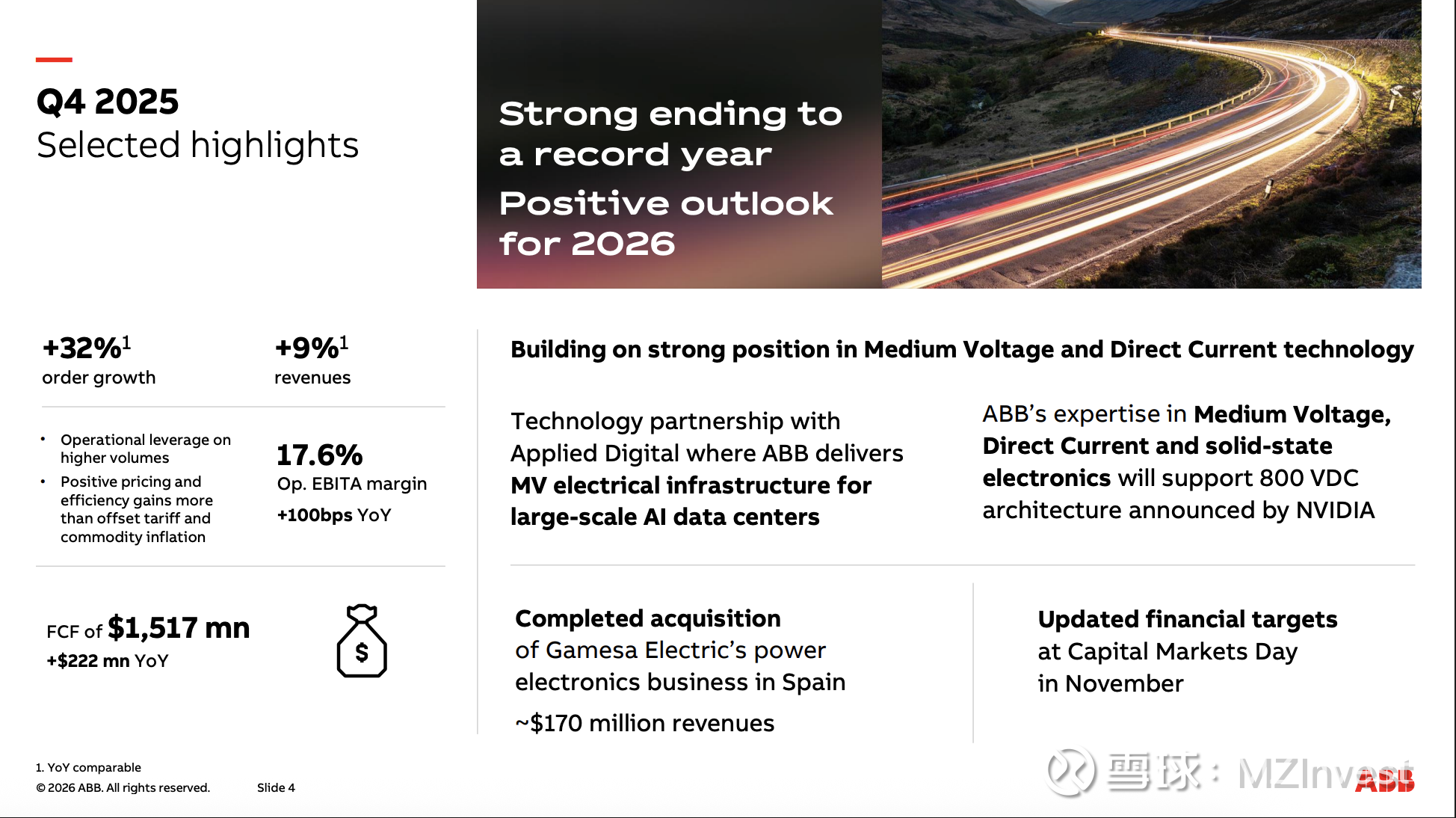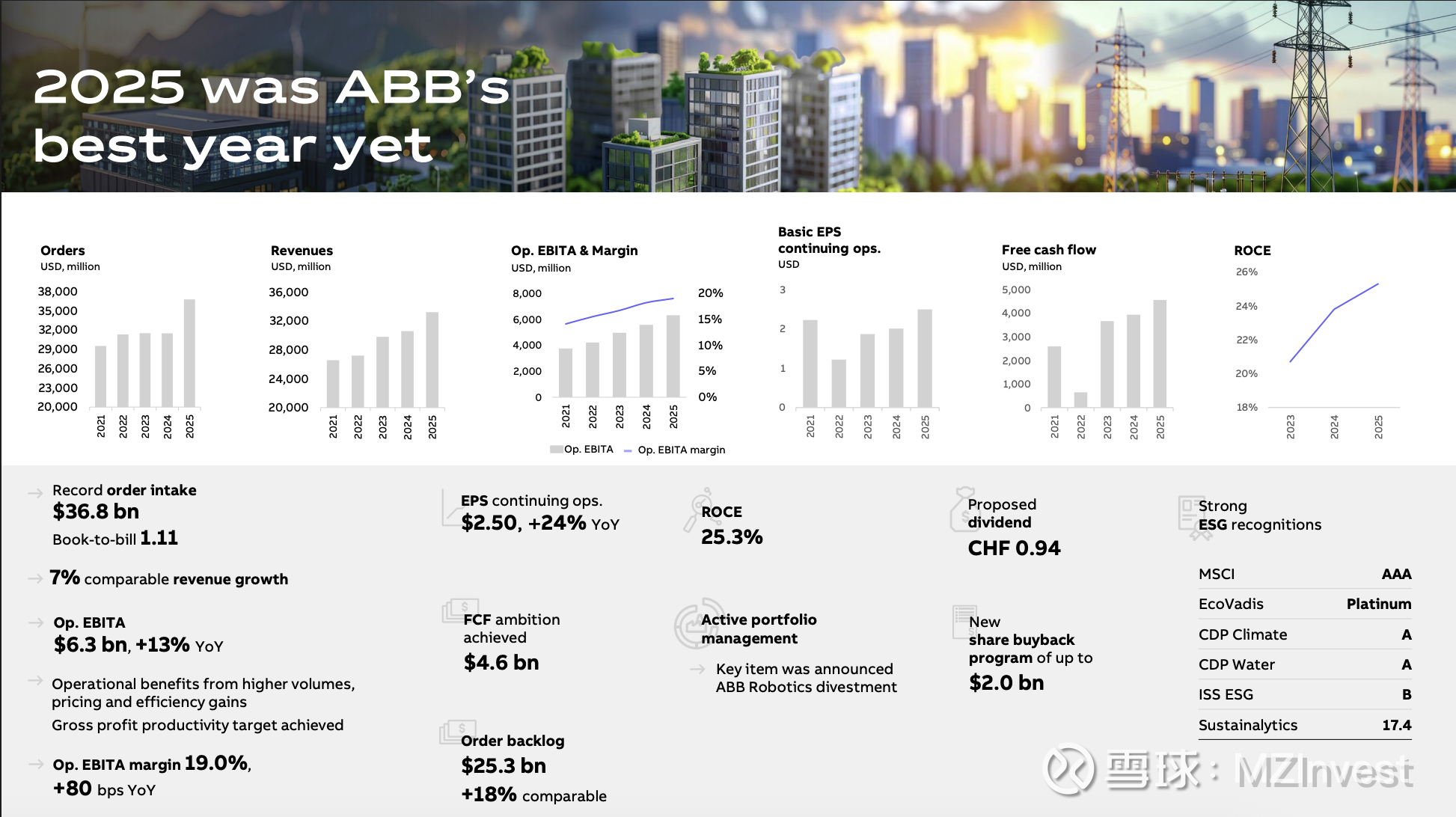 – 创纪录业绩:CEO Morten Wierod 指出 2025 年是 ABB 历史上表现最好的一年。全年运营 EBITA 利润率达到 19%,运营资本回报率(ROCE)高达 25.3%。