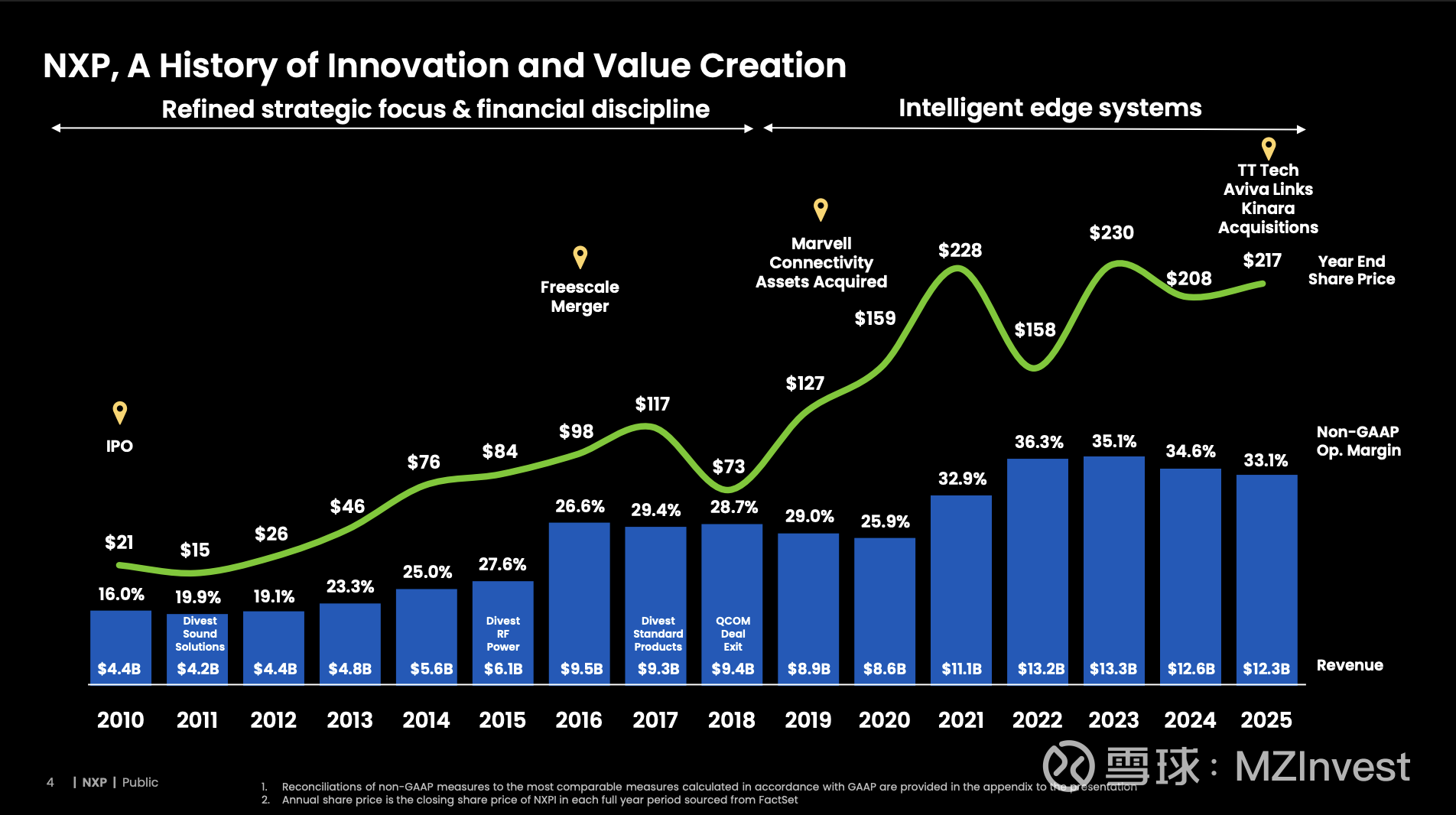 $恩智浦(NXPI)$ 首席执行官 Rafael Sotomayor 报告称:“我们在第四季度的整体表现稳健,所有终端市场的表现均符合或优于预期。所有地区均实现同比增长。”恩智浦在第四季度实现营收 33.4 亿美元,同比增长 7%,环比增长 5%,高出指导性预测中值 3500 万美元。非 GAAP 运营利润率约为 35%。