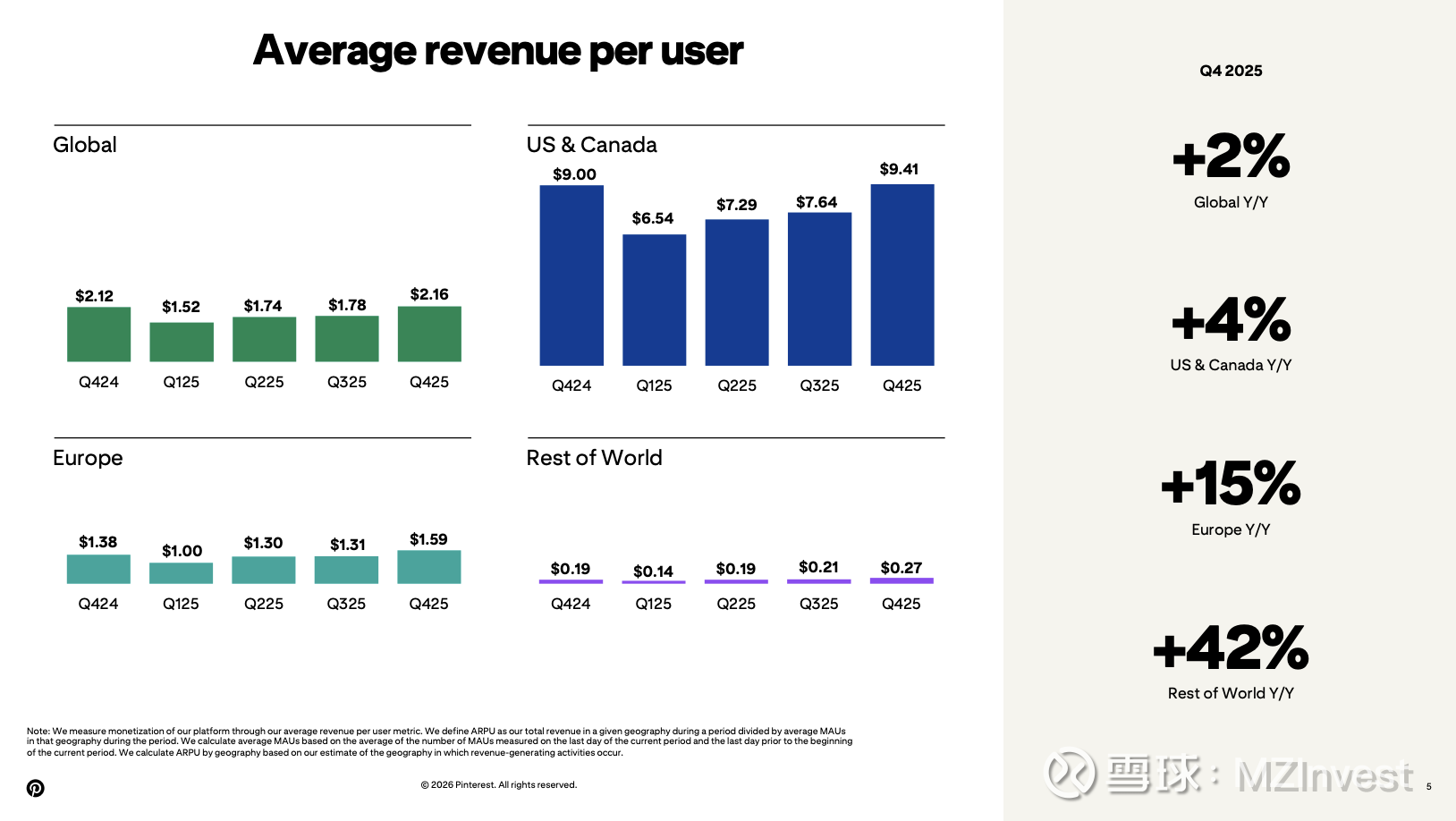 $Pinterest(PINS)$ CEO 比尔·瑞迪(William Ready)在会议开始时强调,Pinterest 正在迅速转型为由 AI 驱动、视觉优先的购物平台。他指出,公司已连续 10 个季度实现用户创纪录增长,全球月活跃用户数(MAU)达到 6.19 亿,第四季度同比增长 12%。然而,瑞迪坦承:“我们对第四季度的营收表现并不满意,认为这并未反映出 Pinterest 的长期潜力。”他将营收疲软归因于“今年关税带来的冲击,这不成比例地影响了我们头部零售广告主的广告支出”,并提出了“扩大收入组合、加速销售及进入市场(GTM)转型”的战略。