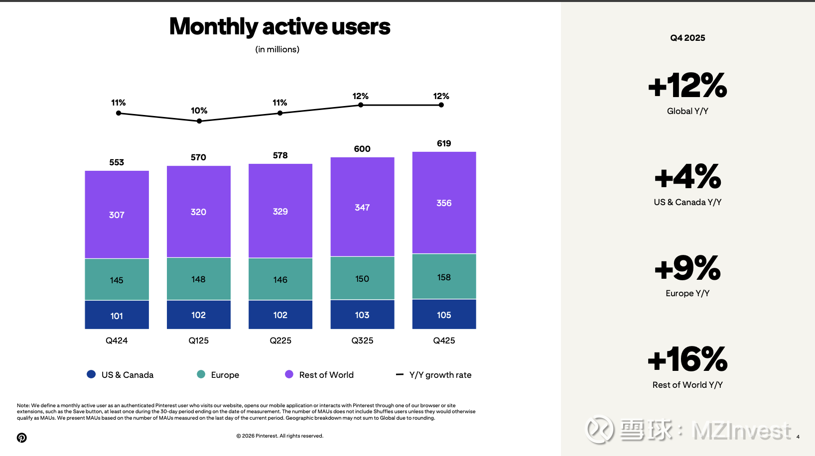 – 用户增长:Q4 全球 MAU 为 6.19 亿。其中美国和加拿大 1.05 亿,欧洲 1.58 亿,世界其他地区 3.56 亿。