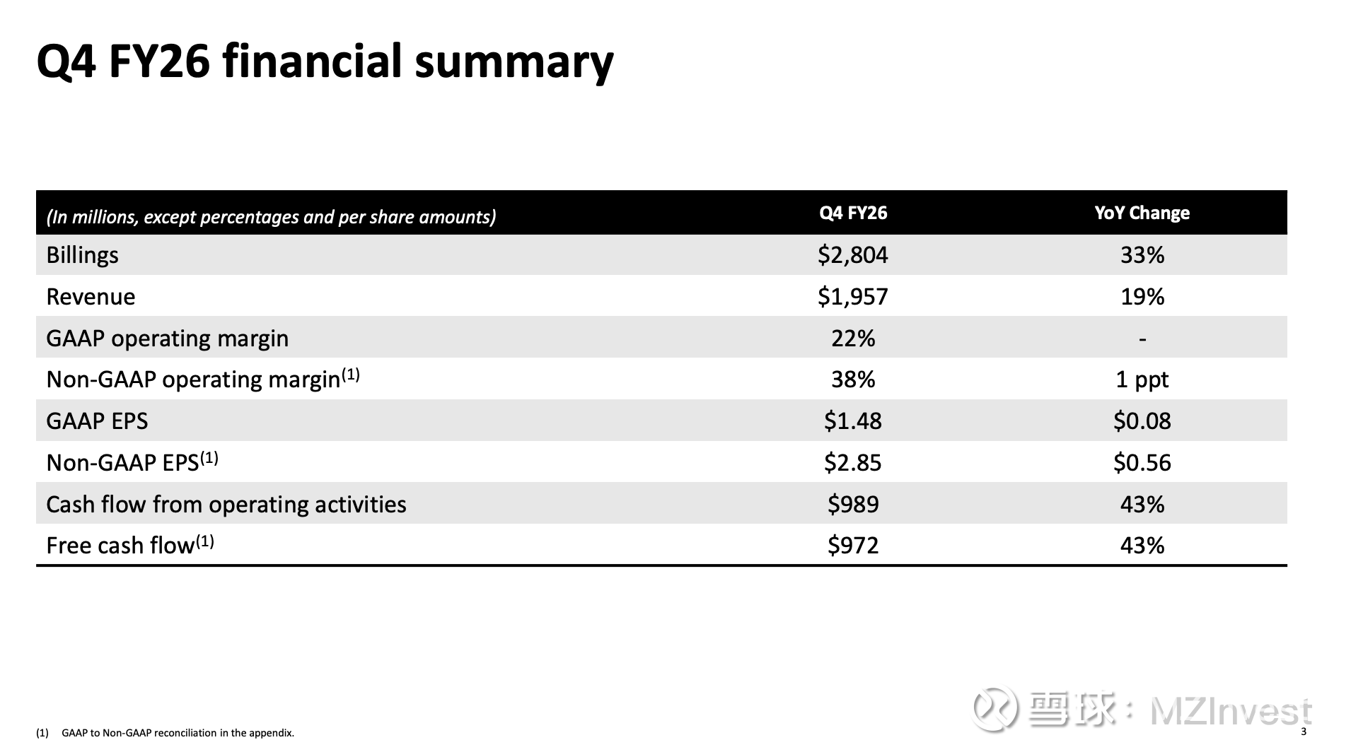 Moorjani 表示:“2027财年,我们的账单收入指引区间为84.8亿美元至85.8亿美元;营收指引区间为81亿美元至81.7亿美元;GAAP营业利润率指引区间为26%至28%;非GAAP营业利润率指引区间为38.5%至39%;自由现金流指引区间为27亿美元至28亿美元。”
