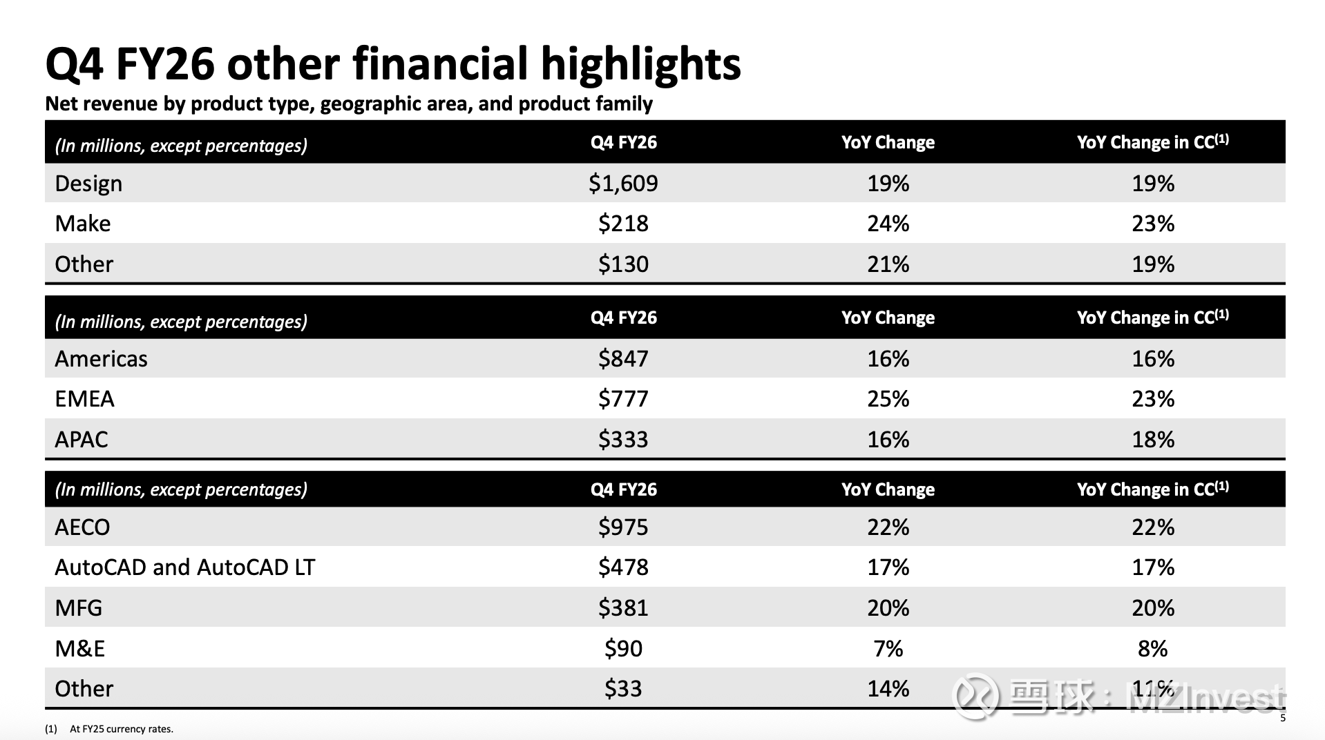 首席财务官 Janesh Moorjani 表示:“第四季度对 Autodesk 来说又是一个强劲的季度,为一个稳健的财年画上句号。Autodesk 持续展现增长与韧性,在加大对云平台和人工智能领导地位投入的同时,也在扩大营业利润率。”他指出:“第四季度总营收按报告口径和固定汇率计算均增长19%。”同时,他解释了新的交易模式对账单收入和营收的影响。Moorjani 还提到资本配置情况,第四季度回购股票3.33亿美元,全年回购总额达14亿美元。