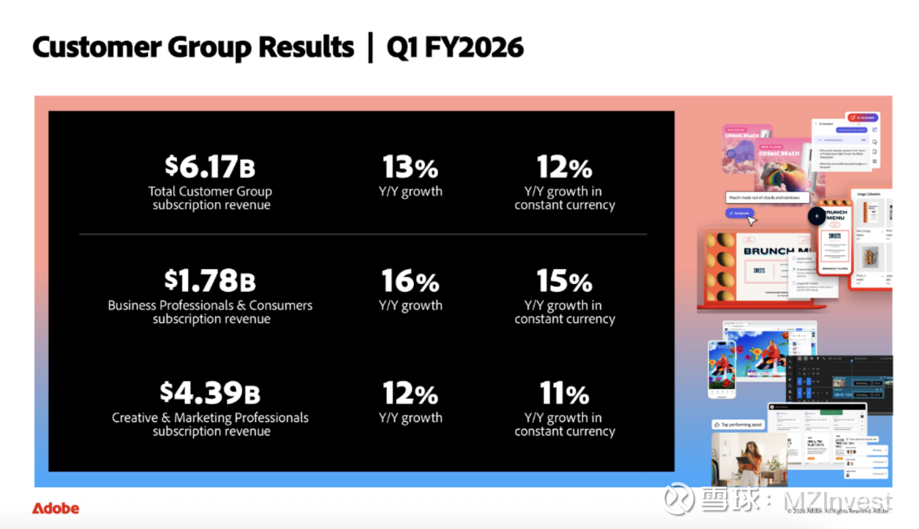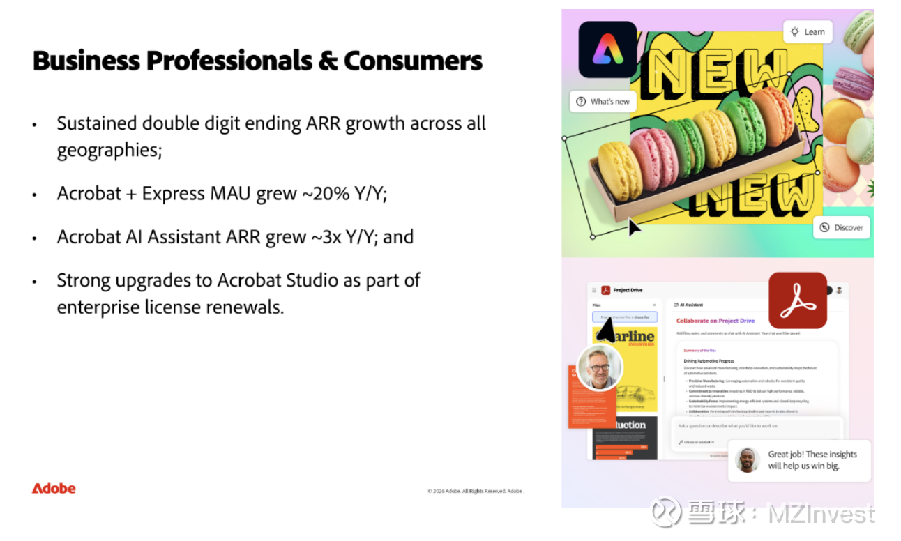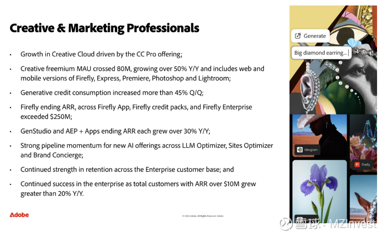 – AI 表现:Firefly 相关业务(应用、积分包及企业版)的总期末 ARR 超过 2.5 亿美元。GenStudio 与 AEP 业务的期末 ARR 同比增长均超 30%。