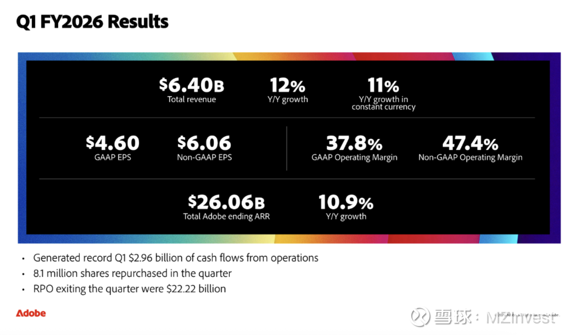 Daniel Durn 报告称,公司第一季度营收达 64 亿美元,按报表口径同比增长 12%,按固定汇率计算增长 11%。GAAP 每股收益为 4.60 美元,非 GAAP 每股收益为 6.06 美元,同比分别增长 11% 和 19%。Adobe 总期末 ARR 达到 260.6 亿美元,同比增长 10.9%。第一季度运营现金流创下 29.6 亿美元的历史新高,期末现金及短期投资余额为 68.9 亿美元,本季度回购了约 810 万股股票。
