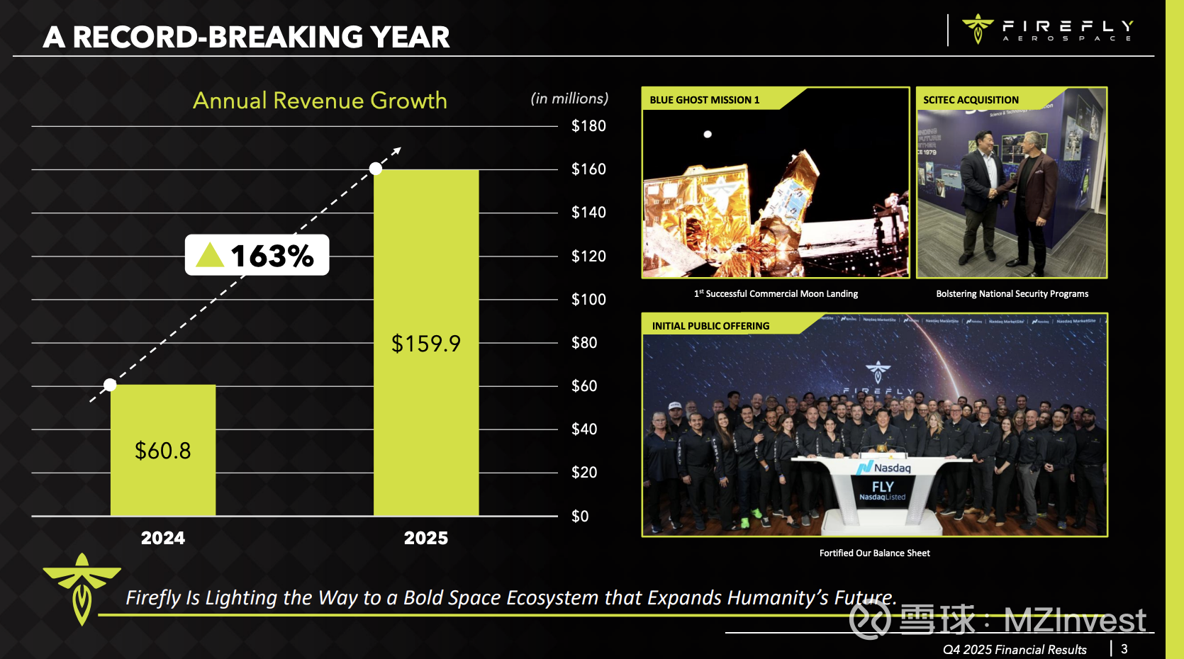 $Firefly Aerospace(FLY)$ 首席执行官 Jason Kim 宣布,Firefly 全年营收翻番,创下 1.6 亿美元的历史新高。公司不仅圆满完成了首次商业登月任务,还成功实现了具有里程碑意义的 IPO 并完成了对 SciTec 的战略收购。Kim 指出:“我们已正式迈入端到端太空服务业务的新纪元。在公司成立的第九个年头,我们交出了这份完美的成绩单。”