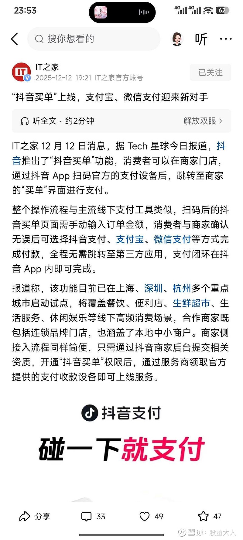 $阿里巴巴-W(09988)$ 抖音又要做线下移动支付了