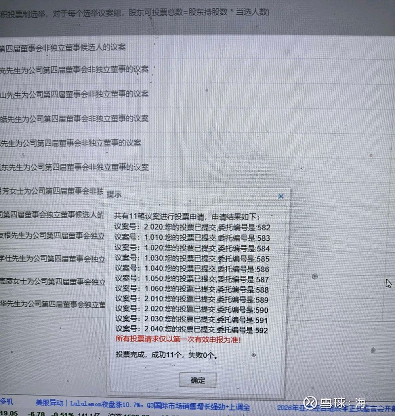 我是按我的股票数给前四位和前三位投了,每位票数都是我的股票数,不知道这样对吗?尽自己力把公司当自己泄愤的温及推荐人选下去!