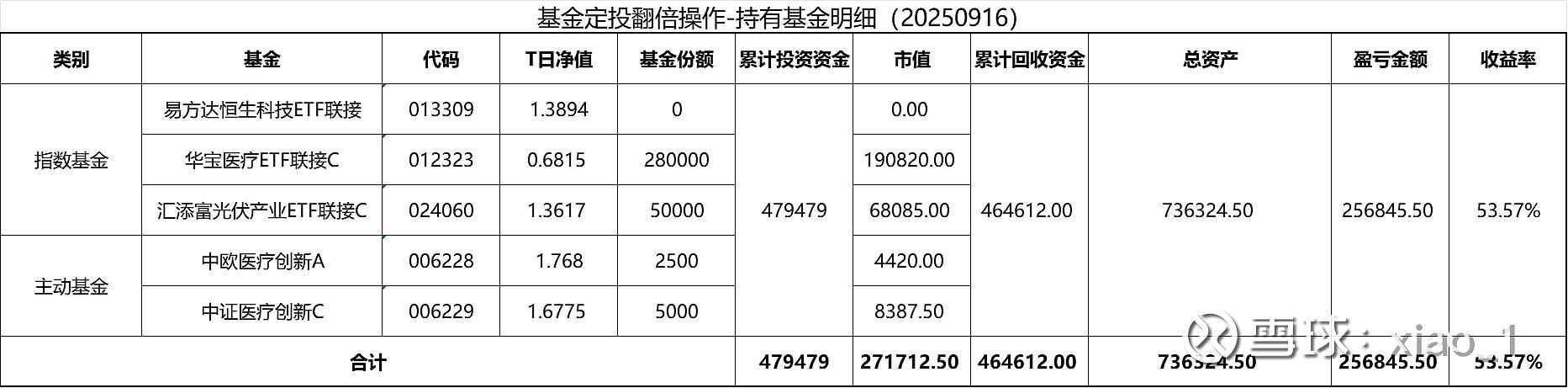 2022年1月开始定投,到2024年9月9日停止定投,共投133期,投入金额479479元。 2025年8月底9月初,按计划减仓。