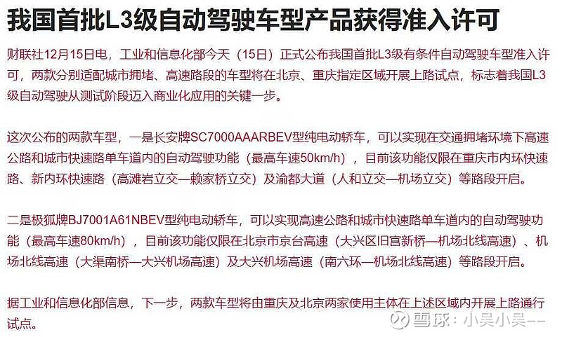 $速腾聚创(02498)$ $禾赛(HSAI)$ 今天国家批准了两款车的L3,都是融合方案,对激光雷达整个行业来说也是里程碑的事件,以后那些徒子徒孙不要再来说纯视觉了。今天不管速腾还是禾赛都值得20厘米,盘后各种解读和自媒体分析轰炸起来。(到目前为止,所有国内L3和L4的批准的测试牌照还是正式牌照,一个纯视觉都没有)