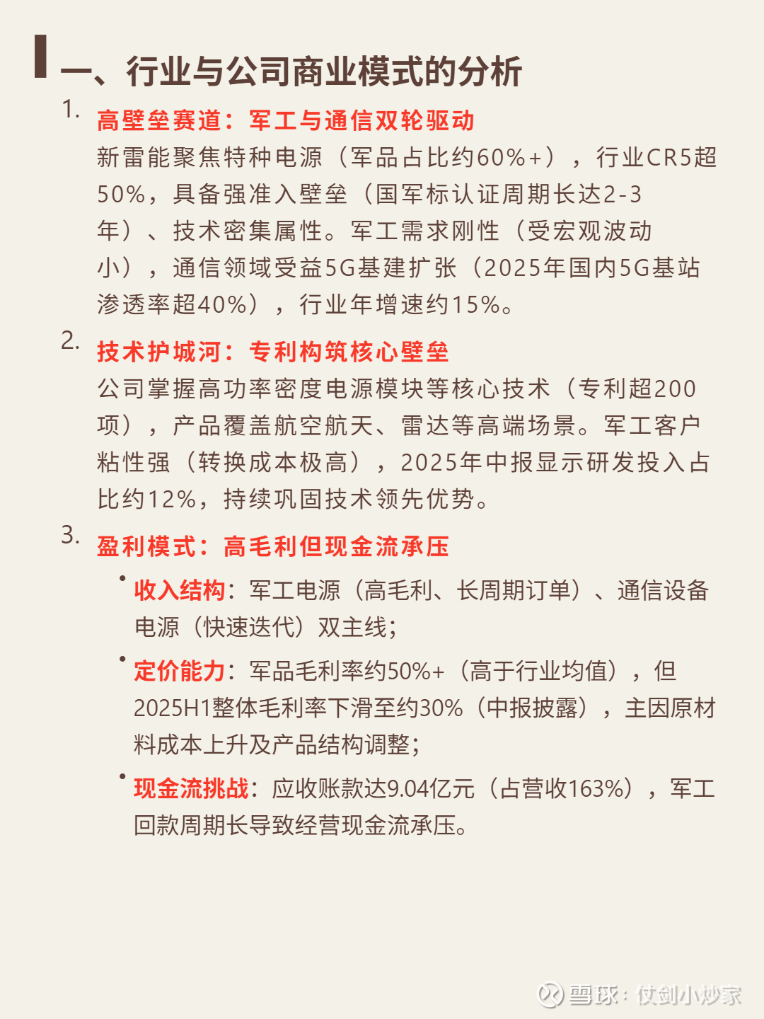 🎯 核心逻辑:聚焦特种电源(军品占比60%+),军工与通信双轮驱动。行业CR5超50%,国军标认证周期2-3年形成强壁垒,技术依赖200+项专利及12%研发投入,客户粘性强但转换成本高。盈利模式为高毛利(军品50%+)但现金流承压,应收账款占营收163%。