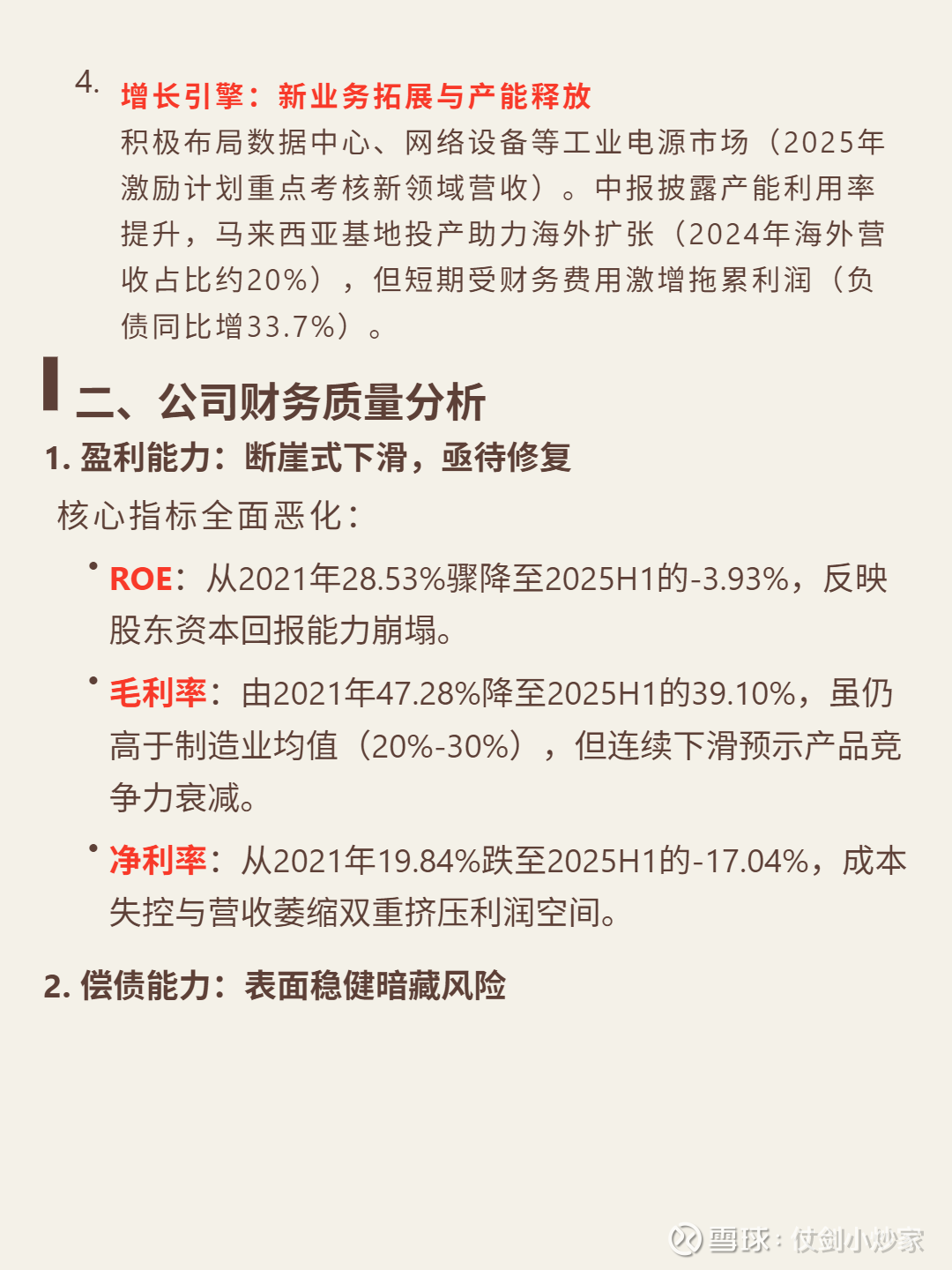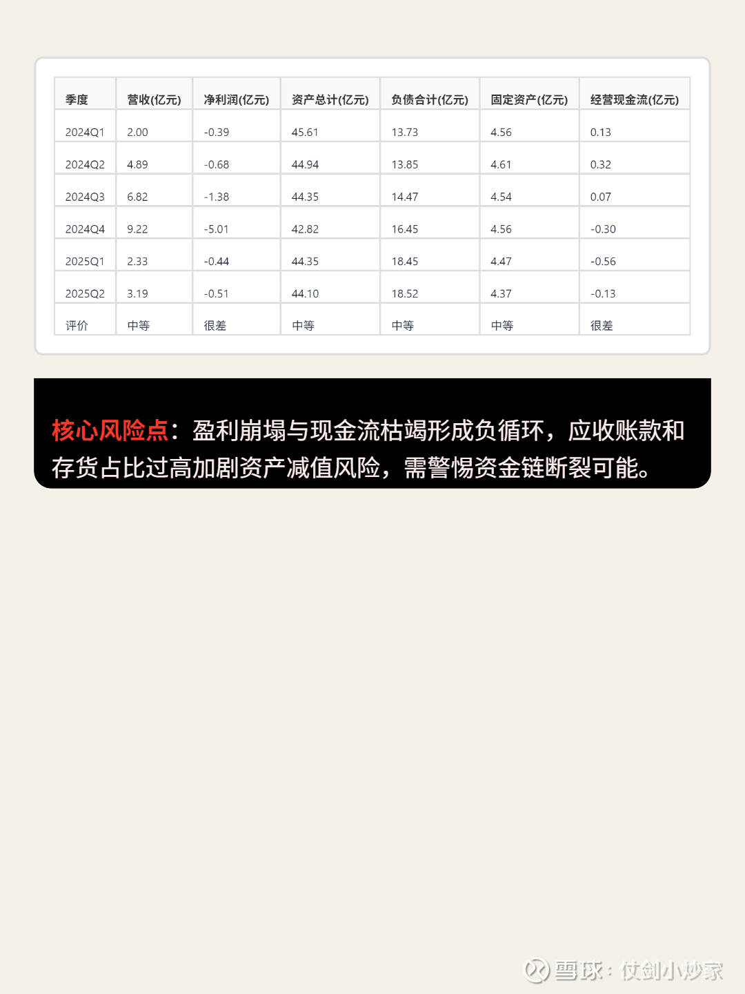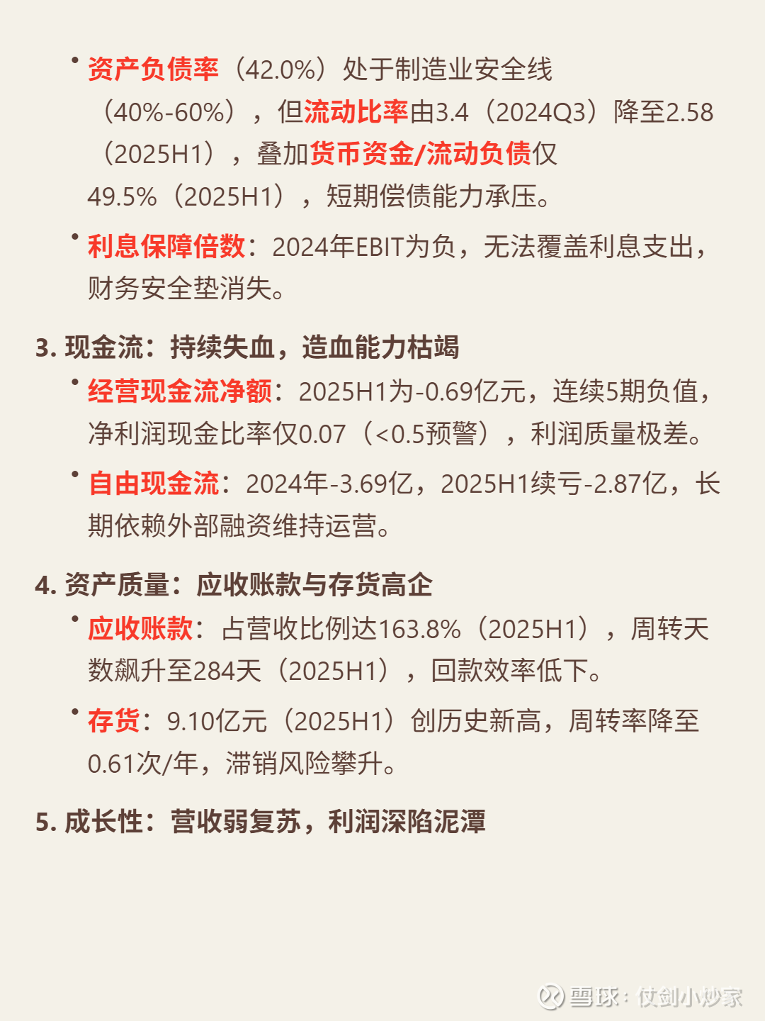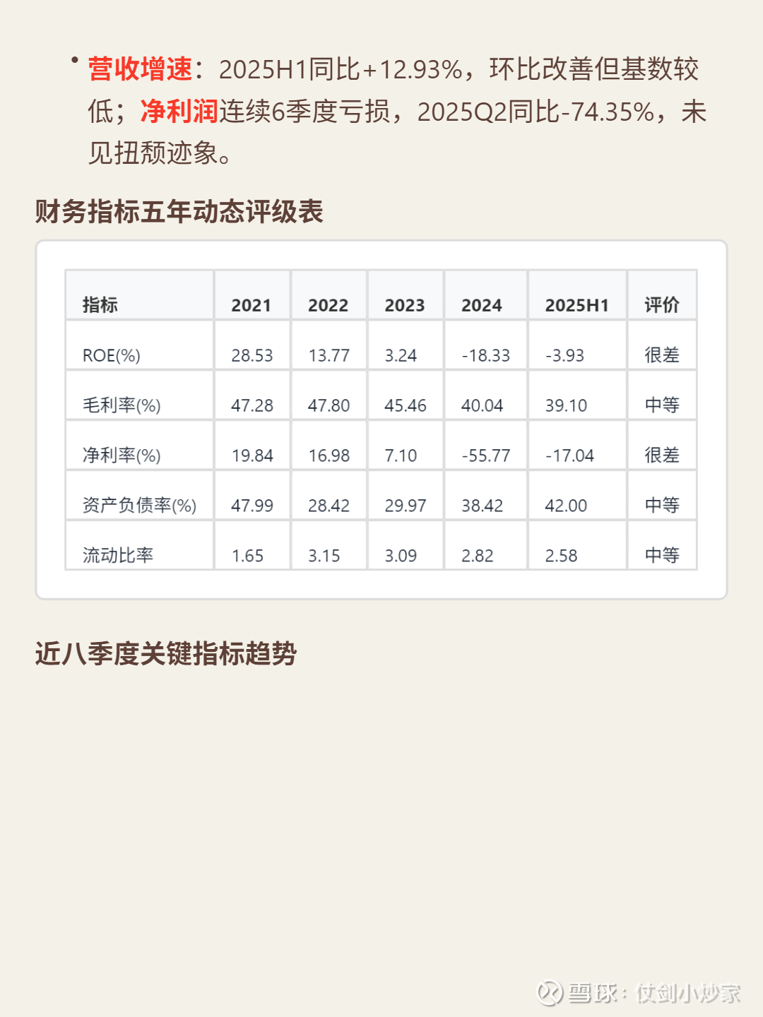 📈 财务表现:ROE从2021年28.53%骤降至2025H1的-3.93%,毛利率从47.28%降至39.10%,净利率从19.84%跌至-17.04%。经营现金流净额连续5期负值(2025H1为-0.69亿),自由现金流2024年-3.69亿、2025H1-2.87亿。应收账款占营收163.8%,周转天数284天;存货9.10亿创历史新高,周转率0.61次/年。营收2025H1同比+12.93%,但净利润连续6季度亏损,未见扭颓迹象。