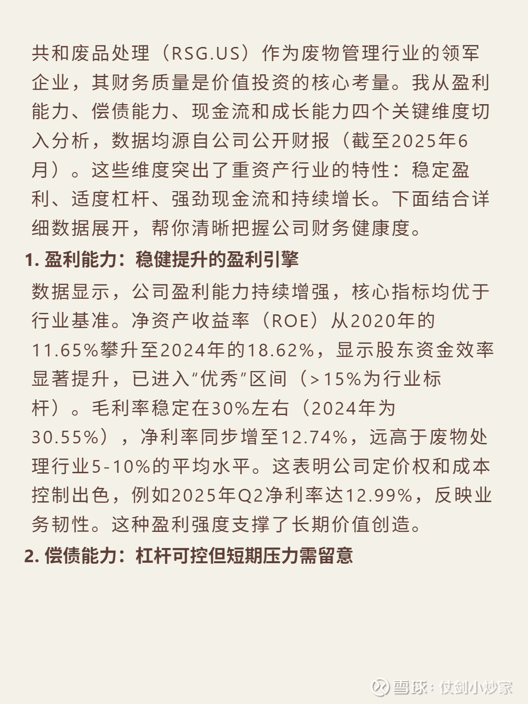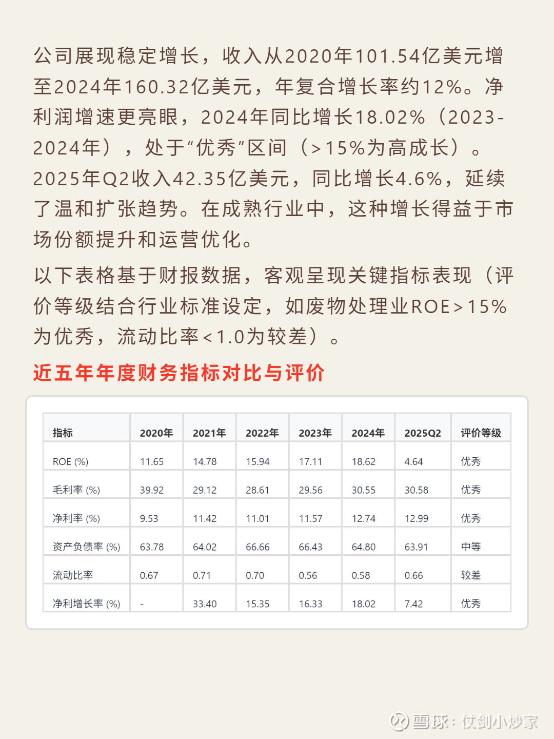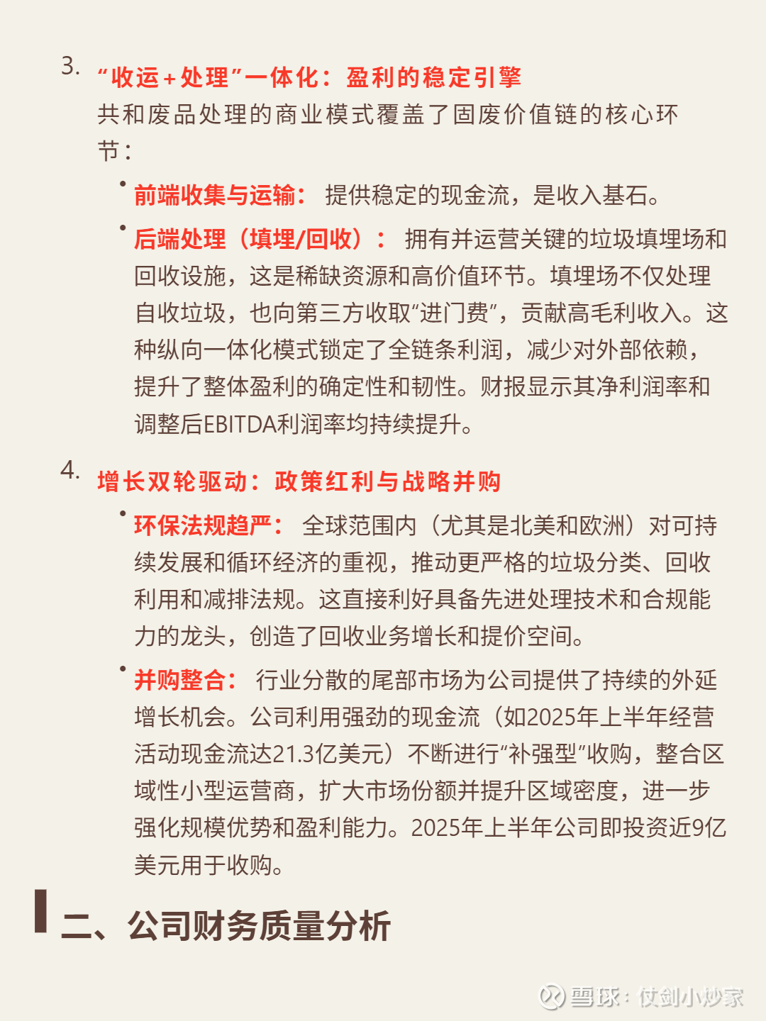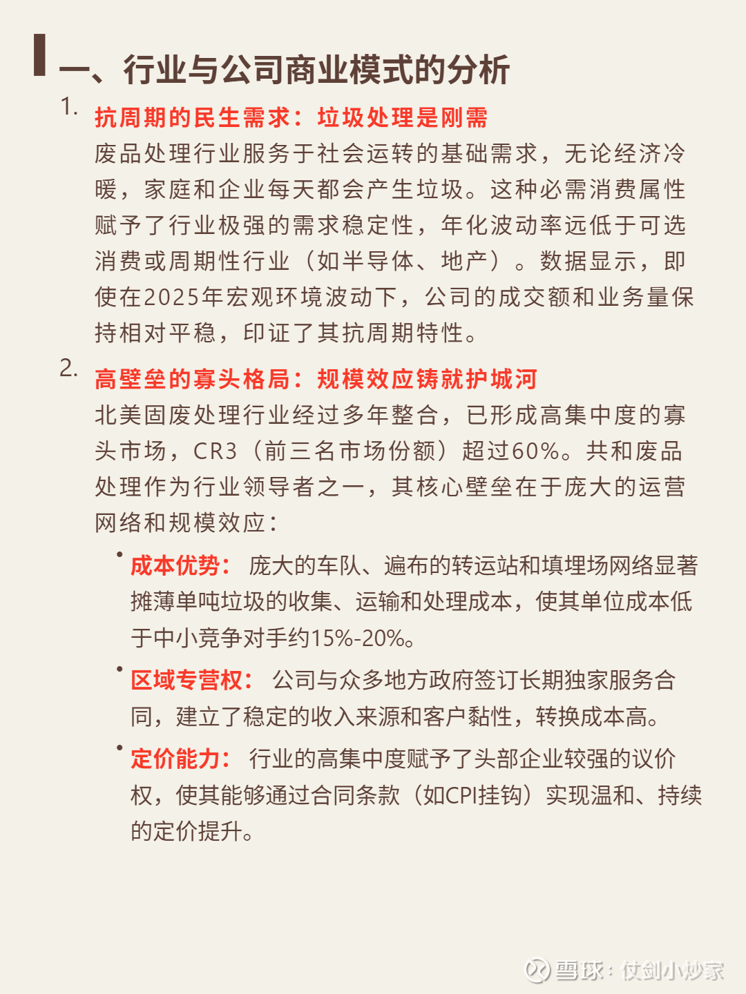 🎯 核心逻辑:固废处理是民生刚需,经济波动下业务量仍平稳(2025年数据印证抗周期);北美行业CR3超60%,公司凭规模效应摊薄单吨成本(比中小对手低15%-20%),长期独家政府合同锁定客户;“收运+处理”一体化,填埋场等高毛利设施贡献利润;增长靠环保政策趋严(回收业务空间扩大)和并购整合(2025年上半年收购9亿美元)。