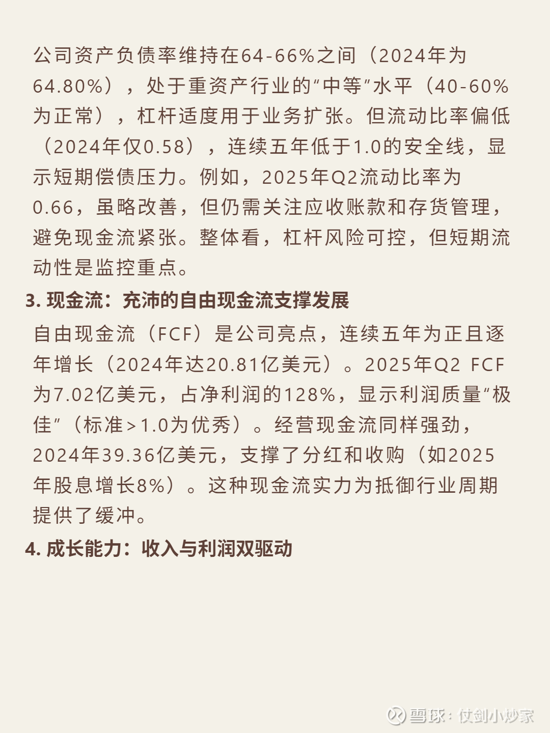📈 财务亮点:盈利能力持续增强,ROE从2020年11.65%升至2024年18.62%(超行业15%标杆),毛利率30%、净利率12.74%(高于行业5-10%均值);现金流充沛,自由现金流连续五年为正且增长(2024年20.81亿美元),2025Q2 FCF占净利润128%(利润质量极佳);收入年复合增长12%(2020-2024年101.54亿→160.32亿美元),净利润增速18.02%(2023-2024);需关注短期偿债压力,流动比率连续五年低于1(2024年0.58)。