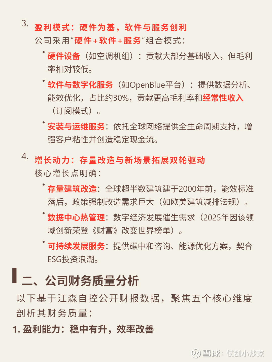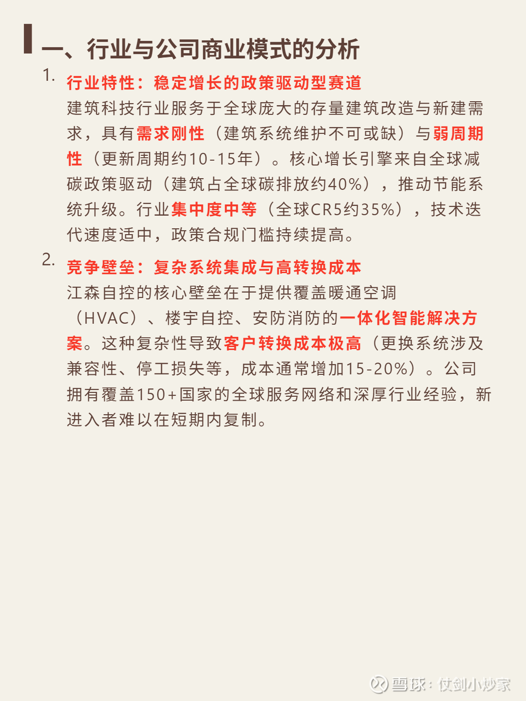 🎯核心逻辑:建筑科技行业需求刚性(维护不可或缺)、弱周期(10-15年更新),增长引擎是全球减碳政策(建筑占碳排放40%)。公司提供HVAC+楼宇自控+安防消防一体化智能解决方案,客户转换成本极高(更换增加15-20%成本),全球服务网络覆盖150+国家,新进入者难复制。