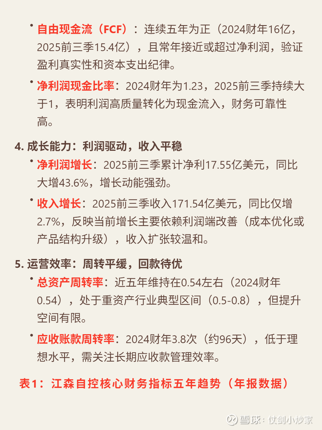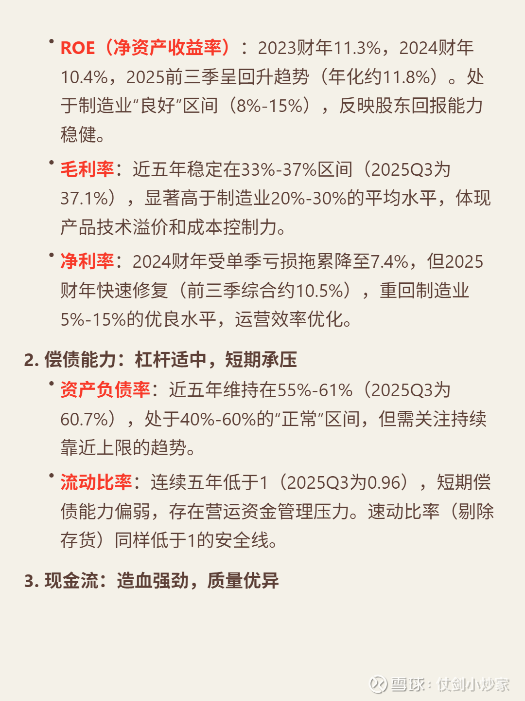 📈财务亮点:自由现金流连续五年为正(2024财16亿,2025前三季15.4亿),净利润现金比率超1(盈利真实)。2025前三季净利润同比增43.6%,毛利率37.1%(优秀)。营收增速2.7%(偏缓),增长依赖利润端改善。流动比率0.96(低于1),短期偿债能力偏弱。