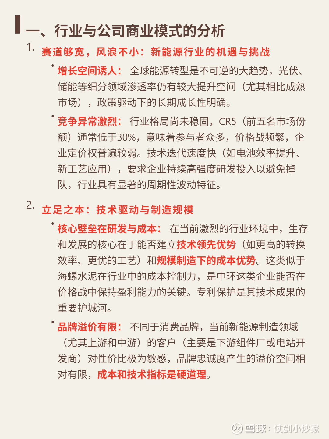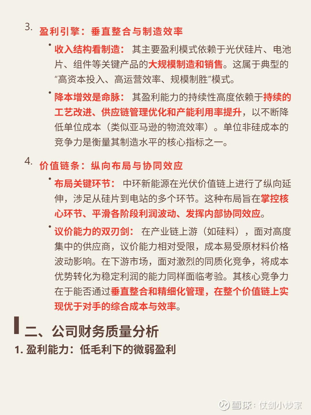 🎯 核心逻辑:新能源制造企业,专注光伏硅片、电池片等产品的大规模制造销售。商业模式依赖技术领先(如转换效率、新工艺)和规模成本优势,垂直整合布局硅片到电站环节以平滑利润波动。客户对性价比高度敏感,品牌溢价有限,成本和技术指标是竞争关键。
