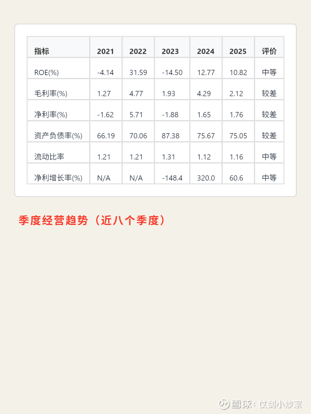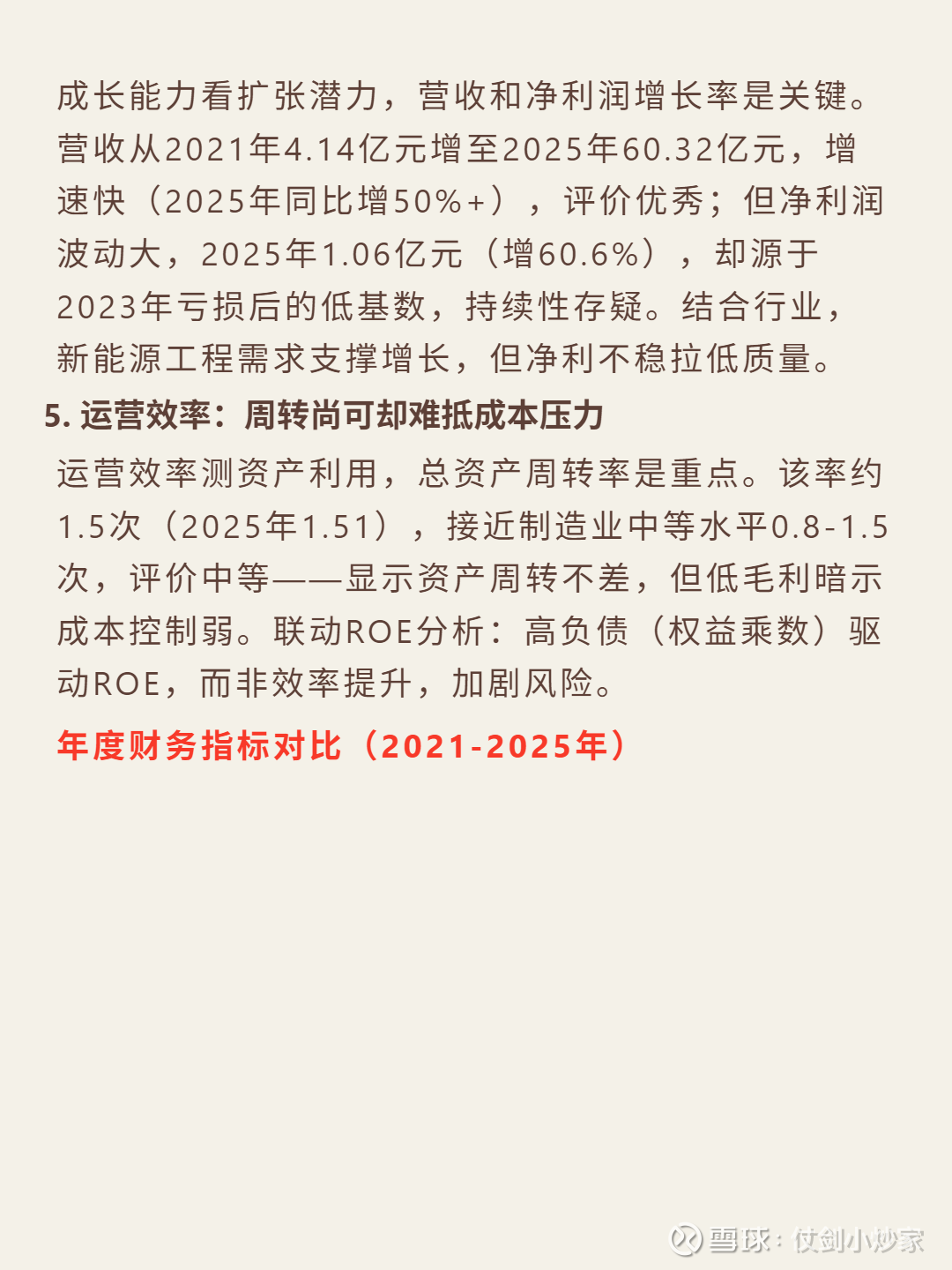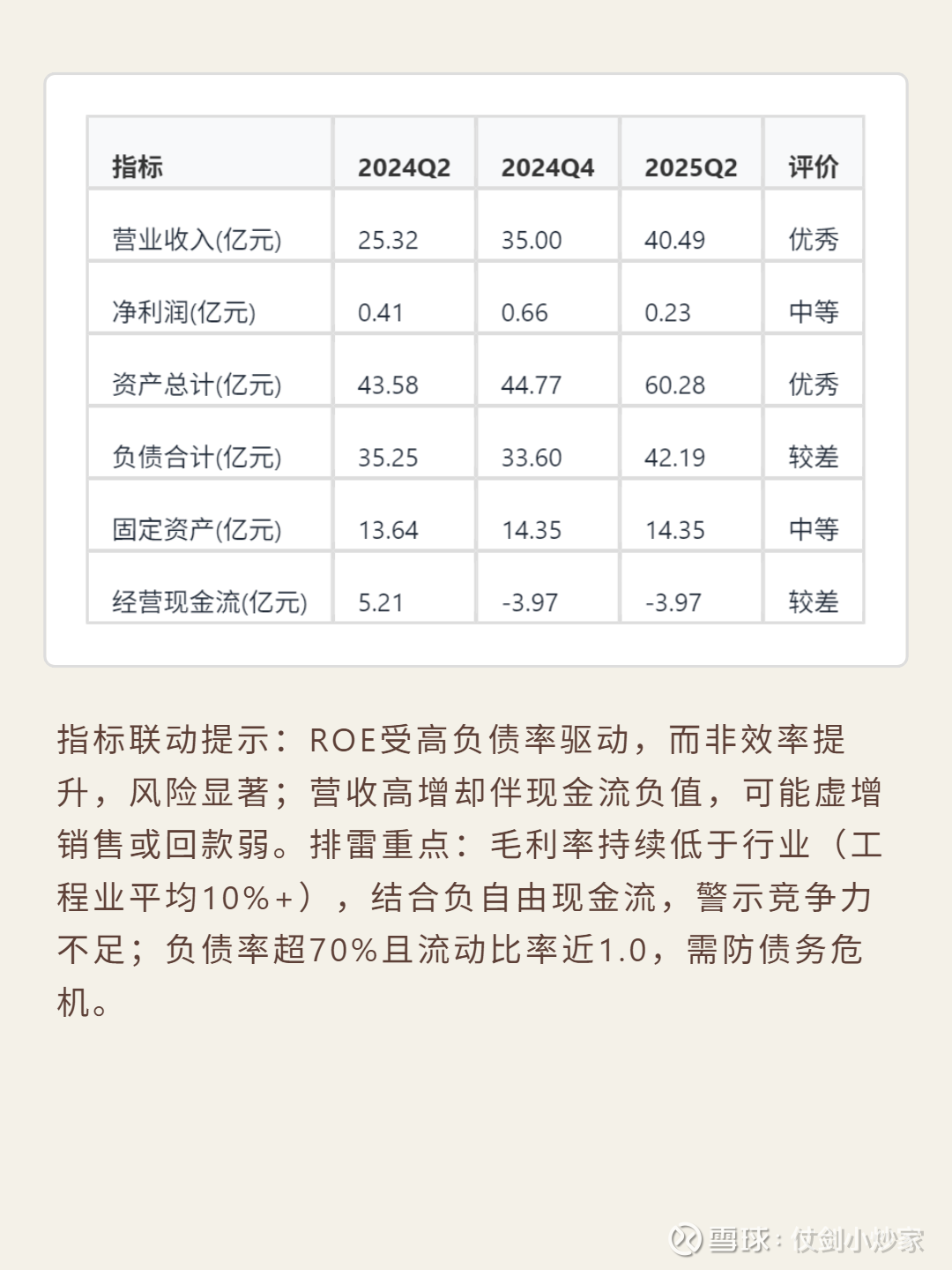 📈 财务亮点:营收高增,2025年达60.32亿元(同比增50%+);毛利率长期仅2%-4%,净利率约1.7%,远低于行业平均;资产负债率超75%,流动比率约1.1,短期偿债压力大;自由现金流连续为负,2025年经营现金流-3.97亿元;ROE约10.8%(2025年),主要依赖高负债驱动,而非效率提升。
