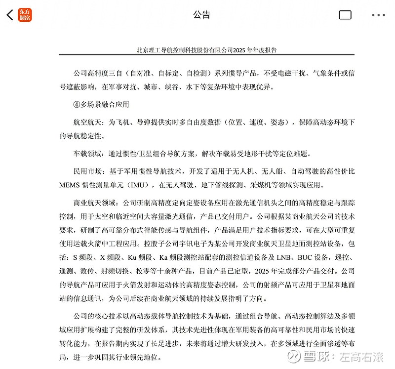 商业航天领域:公司研制高精度定向定姿设备应用在激光通信机头之间的高精度稳定与跟踪控制,用于太空和临近空间大容量激光通信,产品已交付用户。公司根据某商业航天公司的技术要求,研制了高可靠分布式智能传感与导航组件,产品满足用户技术指标要求,可在大型可重复使用运载火箭中工程应用。控股子公司宇讯电子为某公司开发商业航天卫星地面测控站设备,包括:S 频段、X 频段、Ku 频段、Ka 频段测控站配套的测控信道设备及LNB、BUC设备,遥控、遥测、数传、射频切换、校零等十余种产品,目前产品已定型,2025 年完成部分产品交付。公司的导航产品可应用于火箭发射和运动体的高精度姿态控制,公司的射频产品可应用于卫星和地面站的信息通讯,为公司后续在商业航天领域的持续发展指明了方向。$理工导航(SH688282)$
