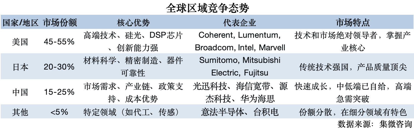 欧美主导高端市场:美国企业如Lumentum、博通在高速率芯片(如1.6T光模块)和硅光集成技术上占据领先,2024年Lumentum研发费用占营收比例达17%,博通单季度研发支出超23亿美元。欧洲企业聚焦激光器核心专利,OSRAM等企业在VCSEL和DFB芯片领域专利数量全球领先。