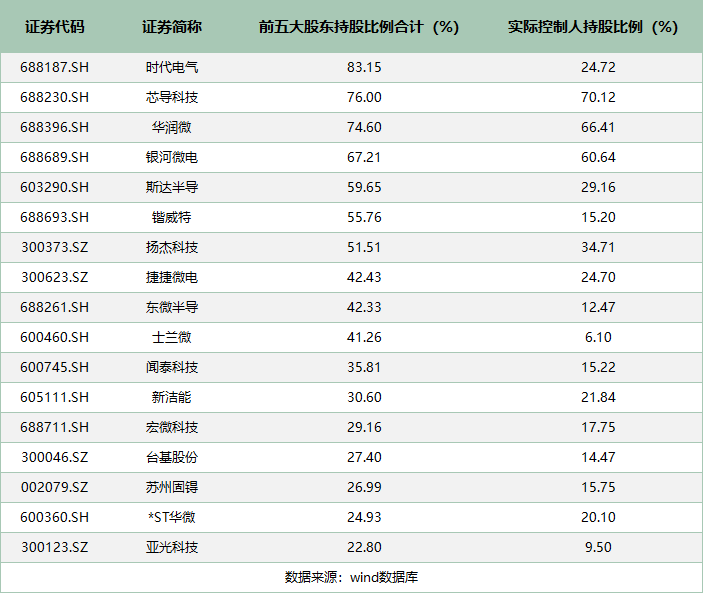 高股权集中度:时代电气(83.15%)、芯导科技(76.00%)、华润微(74.60%)的前五大股东合计持股超70%,股权集中程度高。