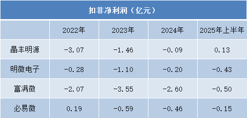 扣除非经常性损益后的净利润数据进一步揭示了行业核心业务的盈利困境。晶丰明源的扣非净利润从2022年的-3.07亿元大幅收窄至2024年的-0.09亿元,并在2025年上半年实现转正,达到0.13亿元。