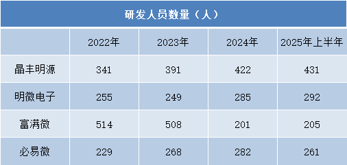 研发人才储备方面,企业策略出现明显分化。晶丰明源的研发团队从2022年的341人增长至2025年上半年的431人,是四家企业中唯一实现连续正增长的公司。