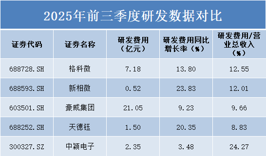 从研发费用总额来看,豪威集团以21.05亿元的研发投入规模遥遥领先,展现出行业龙头对技术研发的重视。格科微研发费用7.18亿元,位居第二。相比之下,新相微研发投入规模相对较小,为0.52亿元。