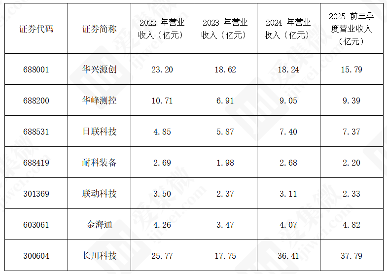 截止11月30日,市值最高的前三名企业是长川科技(488.88亿元)、华峰测控(224.75亿元)、华兴源创(123.09亿元),市值排名与企业业绩增长高度相关,2025年前三季度营收增长前三的金海通、华峰测控和长川科技,市值表现同样强劲。从市盈率来看,截至11月30日,排除亏损企业华兴源创后,市盈率最高的公司是联动科技,其市盈率(TTM)为387.17倍,不过其业绩基数较小,2024年净利润仅2030.37万元。市盈率是排名第二的日联科技(66.11倍) 。