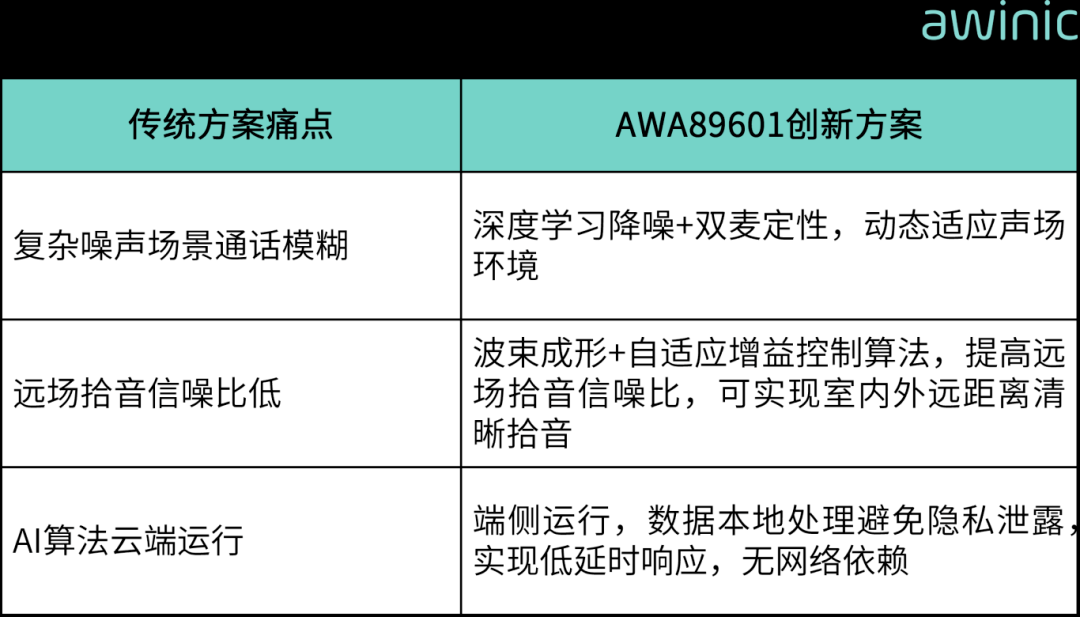 AWA89601芯片的核心创新在于搭载了端侧NPU,内集成音频专用NPU提供端侧推理算力,支持实时处理4路上行语音。相比云端方案,这种集成电路设计实现了数据本地处理,有效避免隐私泄露,同时实现低延时响应,无需依赖网络连接。