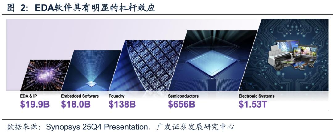 作为集成电路产业链当之无愧的金字塔塔尖,EDA处于产业最上游核心位置,是连接设计、制造、封测各环节的关键纽带。2024年全球EDA+IP的市场规模近200亿美元,却撬动着超6000亿美元的半导体产业,1.5万亿电子信息产业规模,进而支撑起超过数十万亿美元的数字经济。