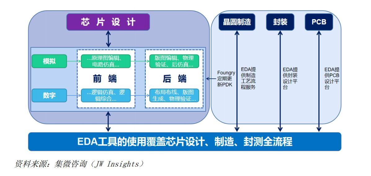 模拟设计EDA工具:聚焦电路仿真、版图设计与编辑、参数提取等环节,主要服务于电源管理芯片、射频芯片等小规模模拟器件。设计高度依赖专家经验,自动化程度低、迭代周期长,相对数字芯片,模拟设计过程较为简单,没有前端设计与后端设计之分,物理设计环节的EDA工具与晶圆厂/IDM制造部门的联系较为紧密。